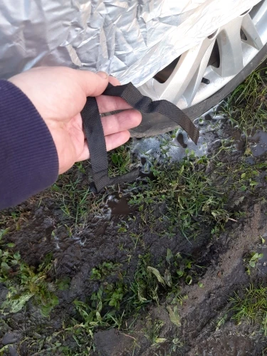 Ткань тонкая, и ее необходимо прикрепить к колесам с помощью веревки.