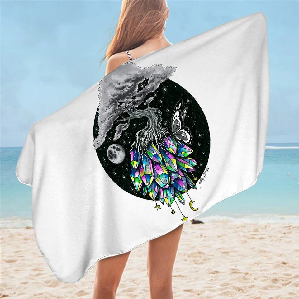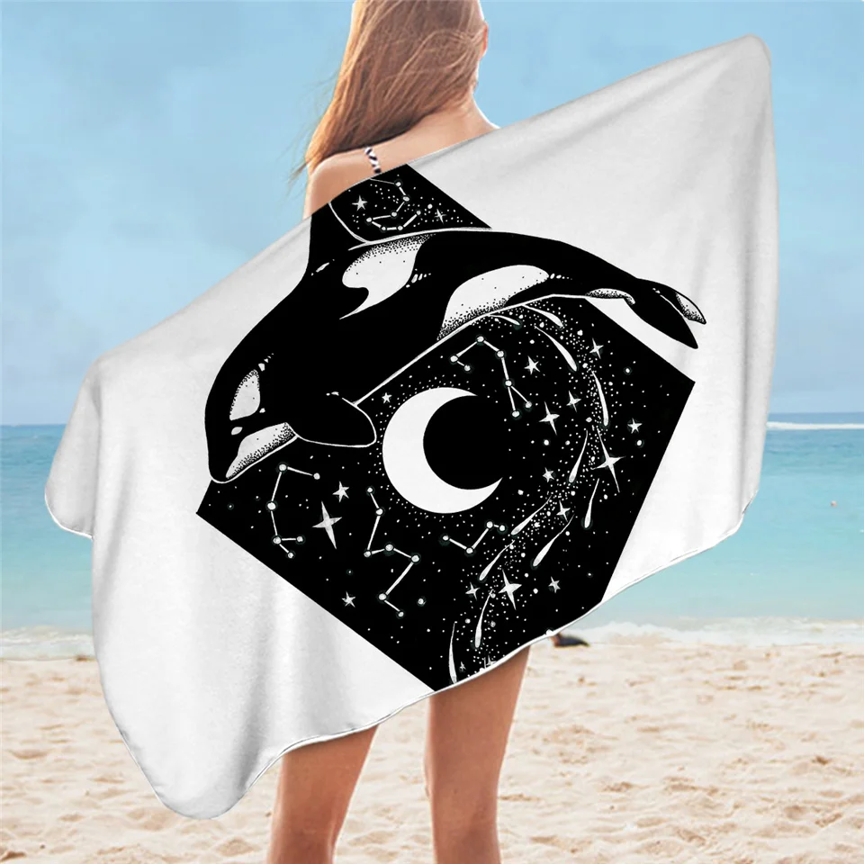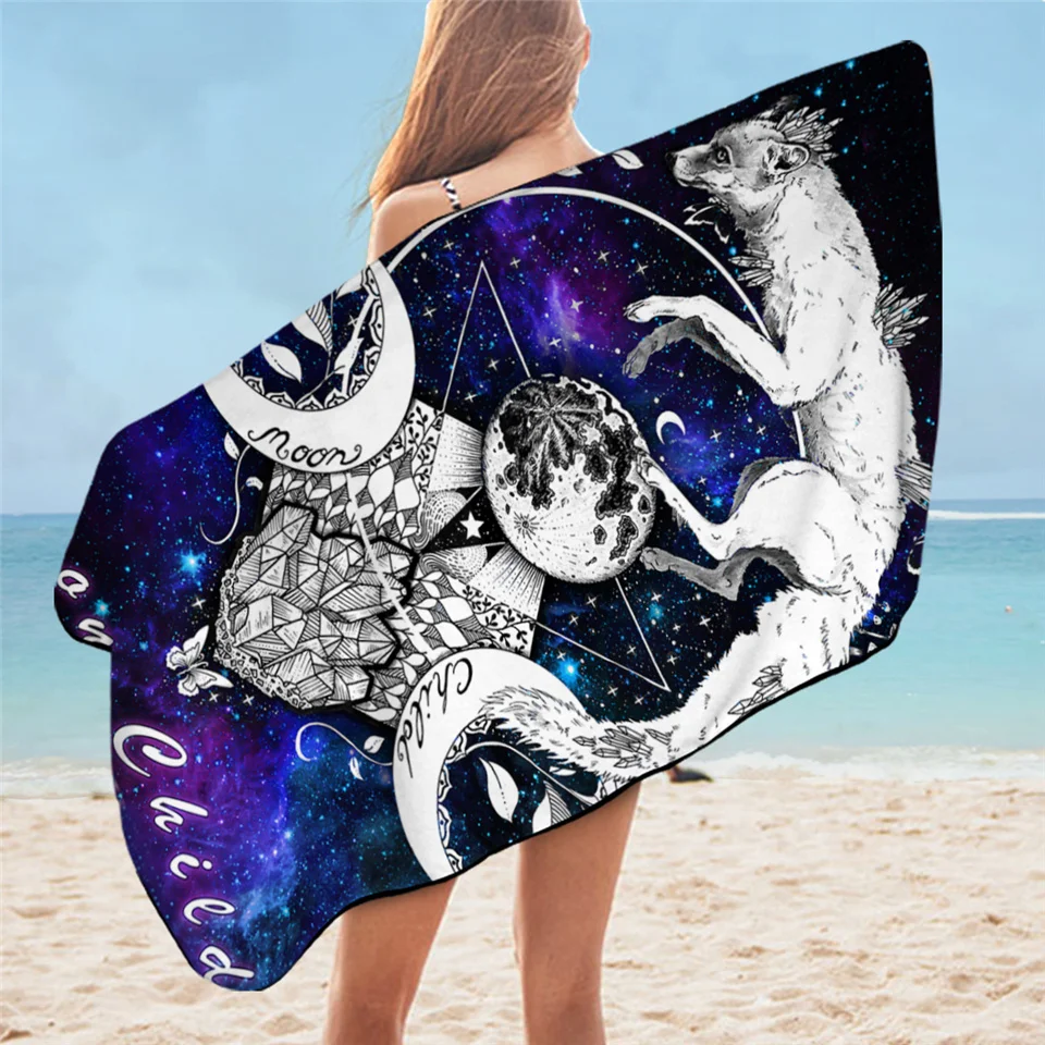 Прямоугольное полотенце для ванной с изображением Луны и животных, черное пляжное полотенце с изображением лисы, волка, галактики, планеты, синего и фиолетового цветов