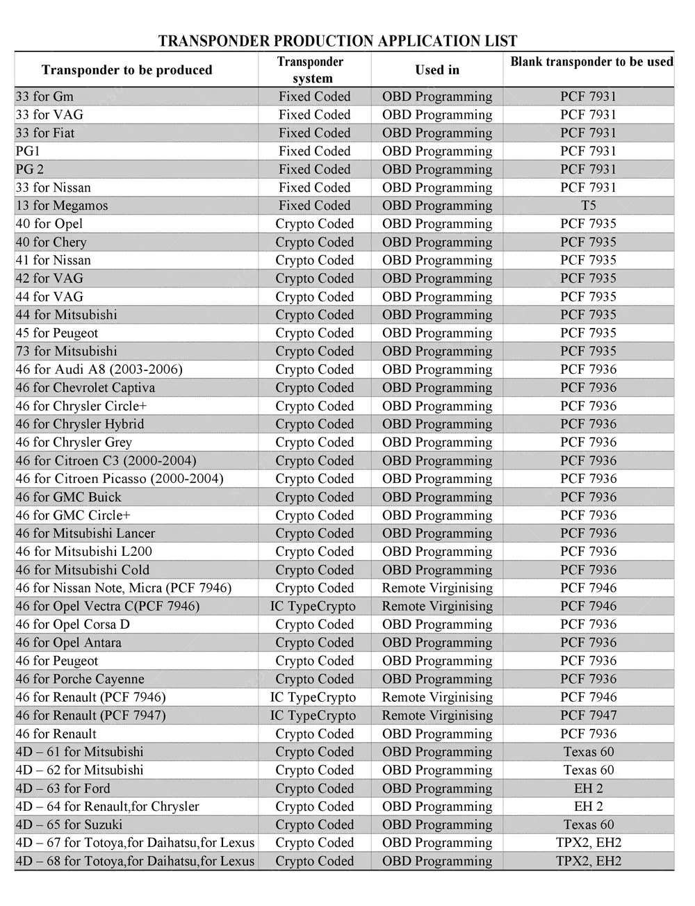 Если у вас есть OBD-устройство типа T-Code Pro, Вам понадобятся специальные предустановленные транспондеры для некоторых автомобилей. Вместо того, чтобы покупать эти специальные транспондеры по высоким ценам, вы можете производить их с Zed BULL, используя пустые транспондеры. И вам не нужны дорогие предварительно кодированные транспондеры по цене около 8-10 евро. Пока Zed BULL имеет 24 различных производственных приложения транспондеров.