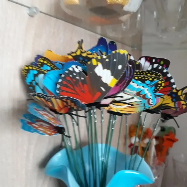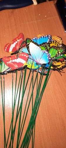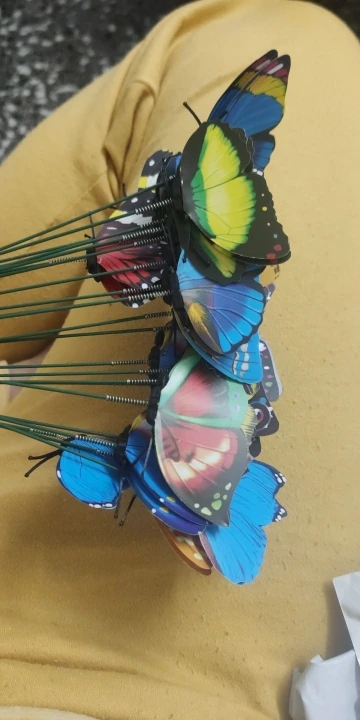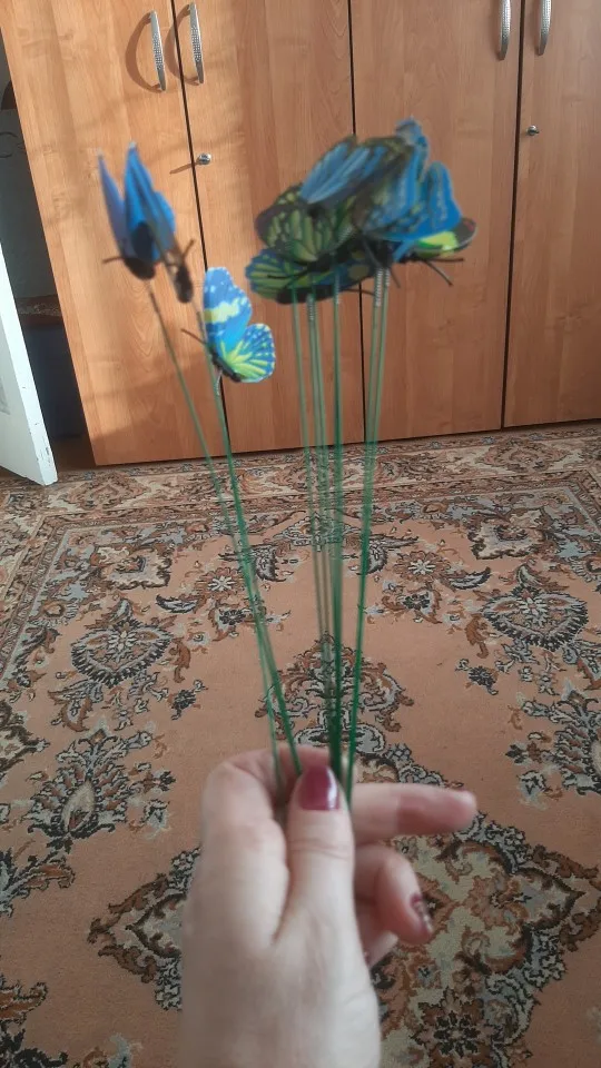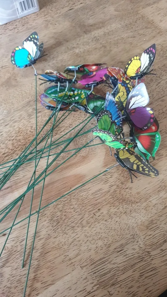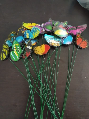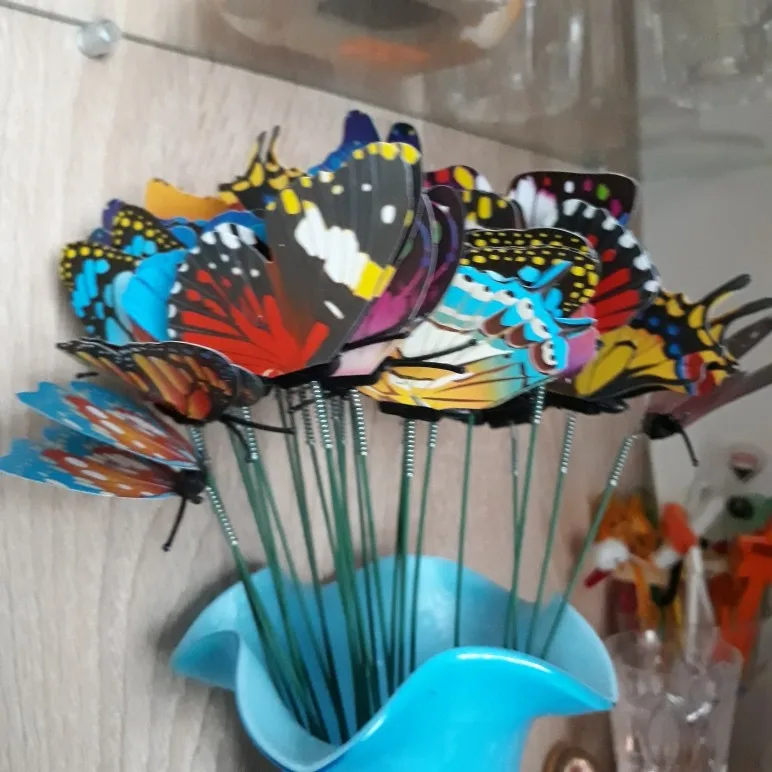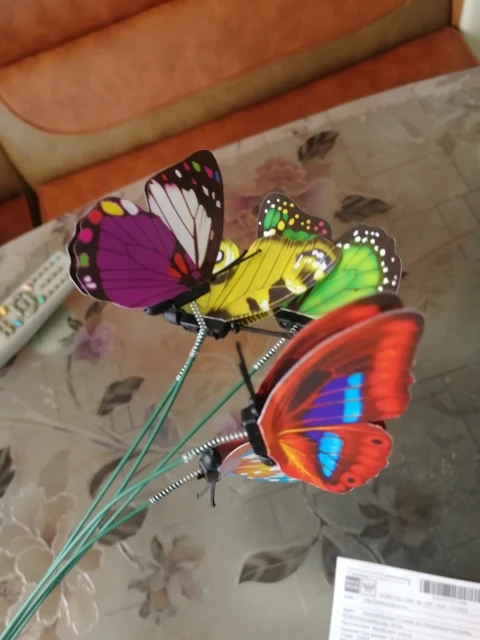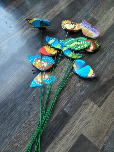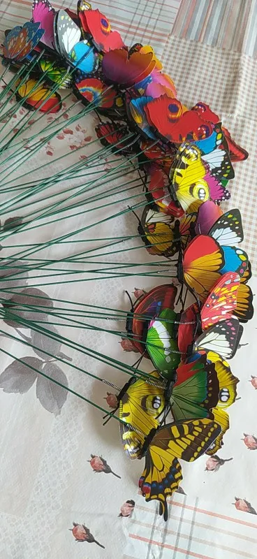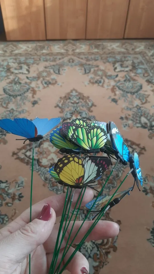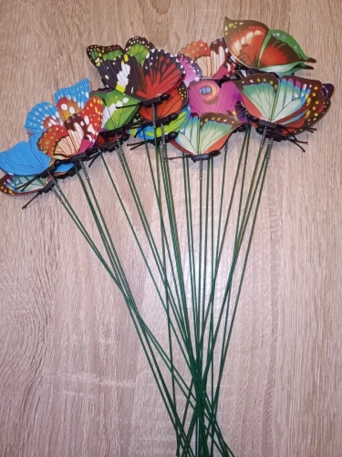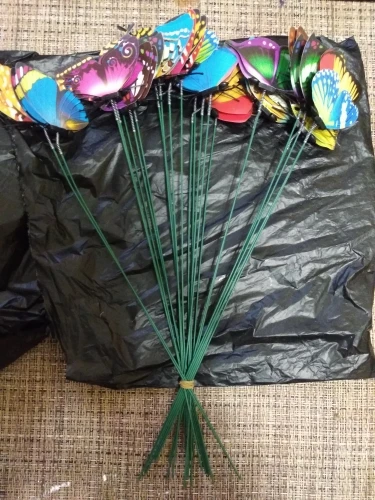 Бабочки неплохие, небольшие, примерно 4-5см, но прутья , на которые они закреплены очень тонкие, тоньше , наверное, чем зубочистки. В почву входят нормально, не гнутся. И , спасибо продавцу, отправил их, хотя бы , не сгибая прутья.