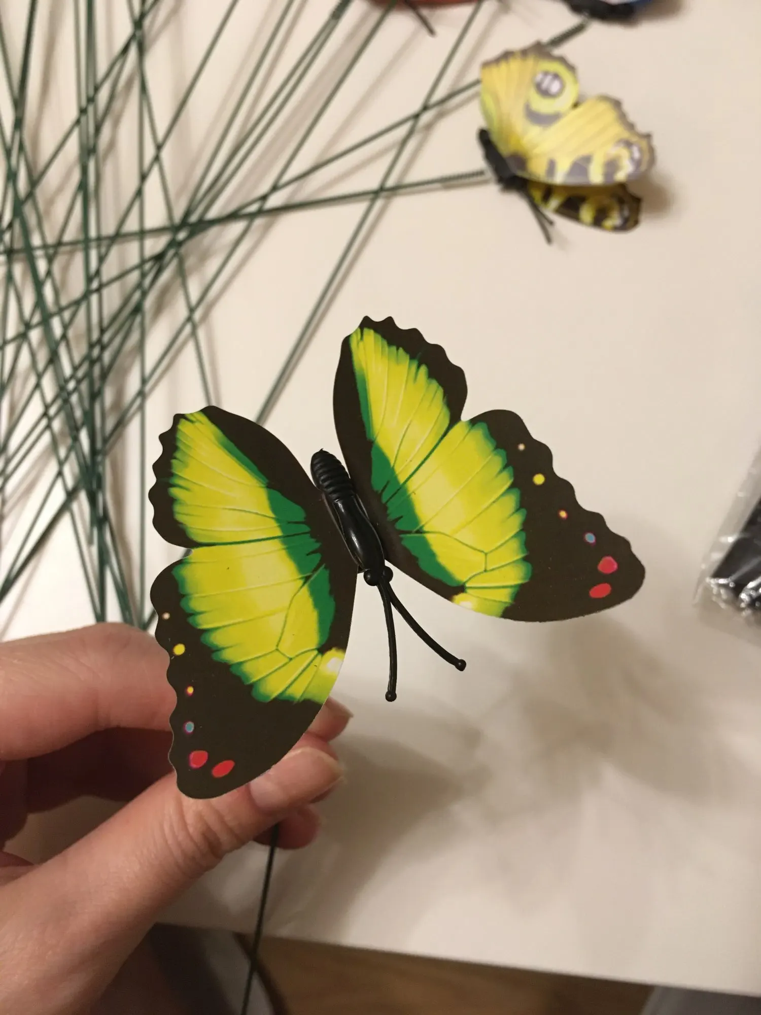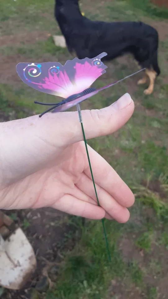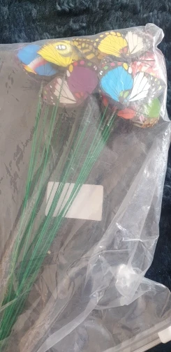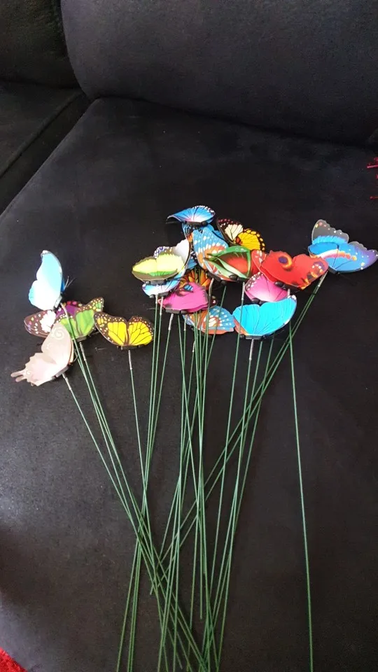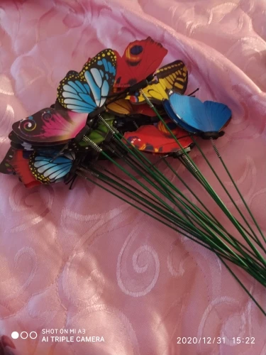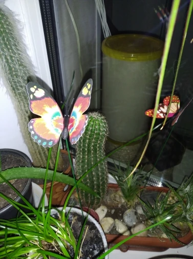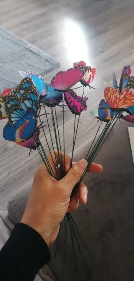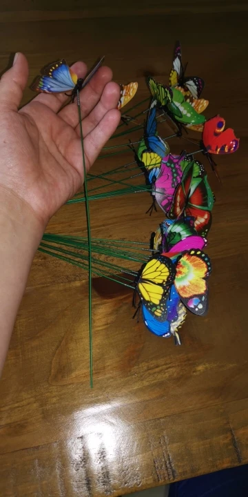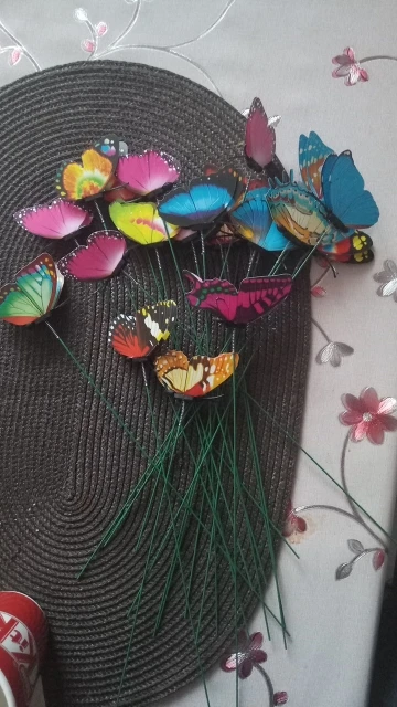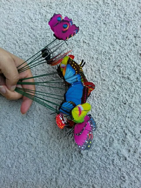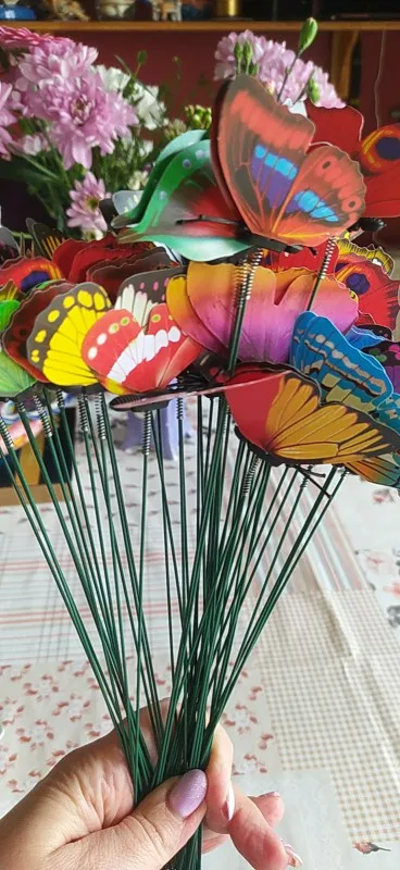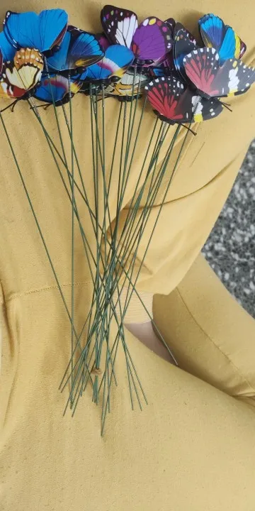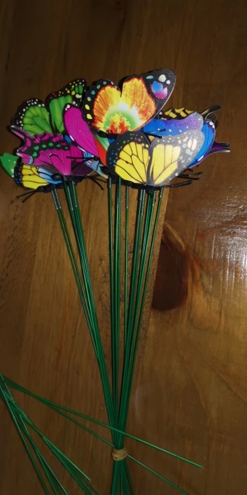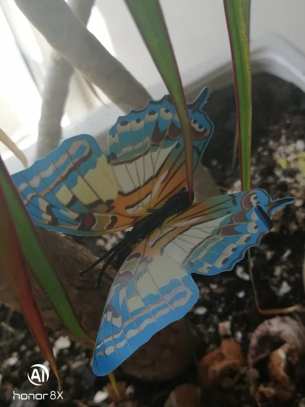 Бабочки неплохие, небольшие, примерно 4-5см, но прутья , на которые они закреплены очень тонкие, тоньше , наверное, чем зубочистки. В почву входят нормально, не гнутся. И , спасибо продавцу, отправил их, хотя бы , не сгибая прутья.
