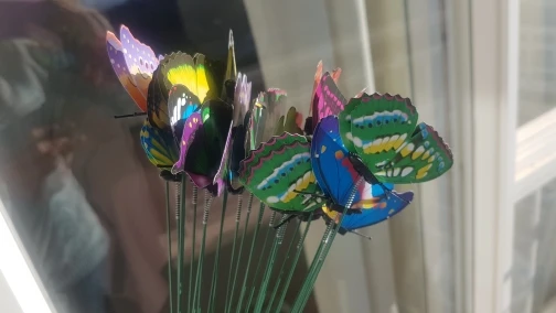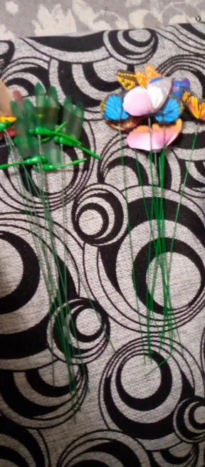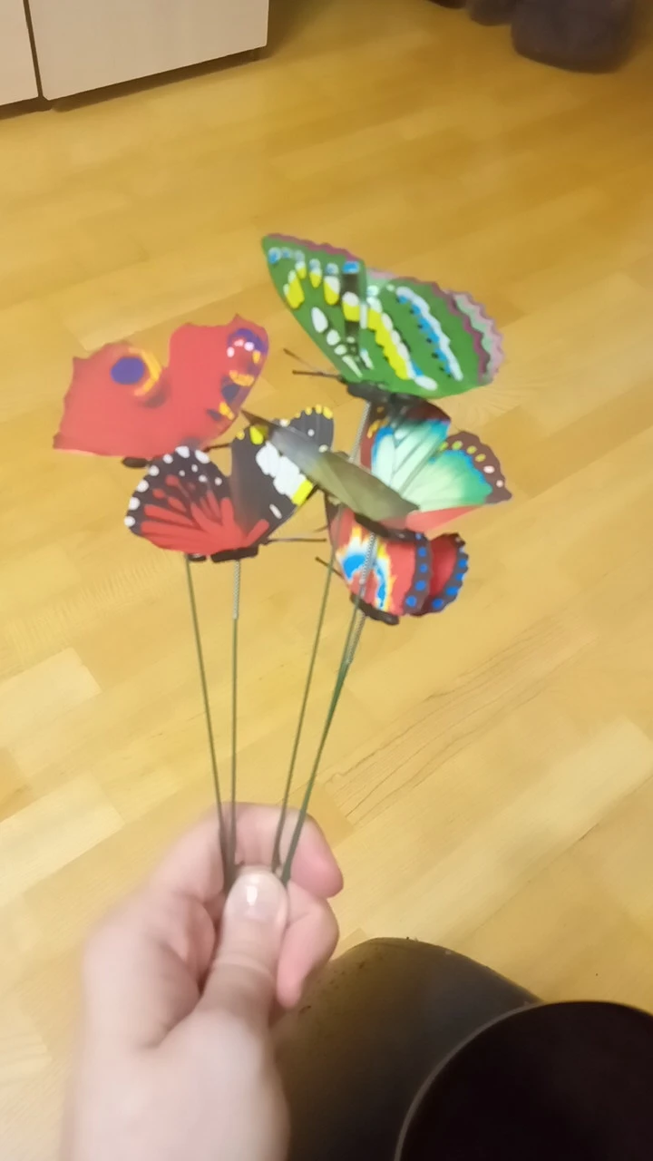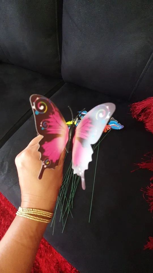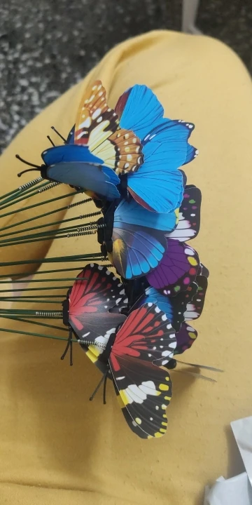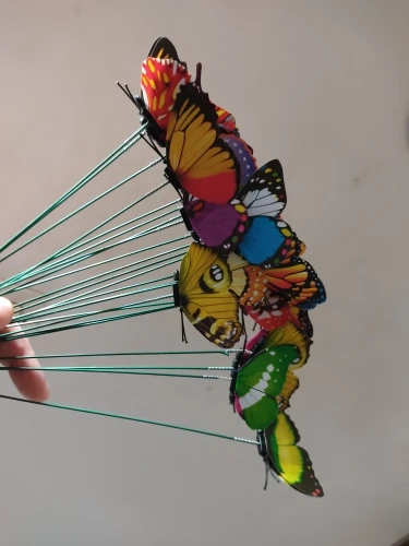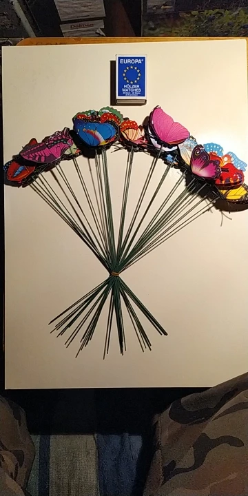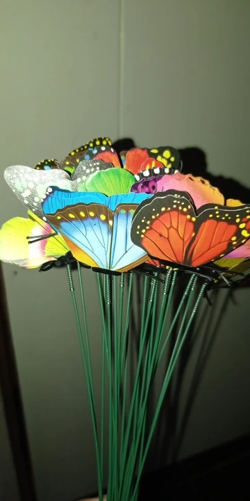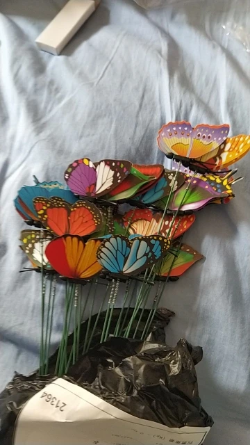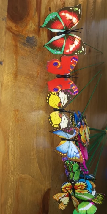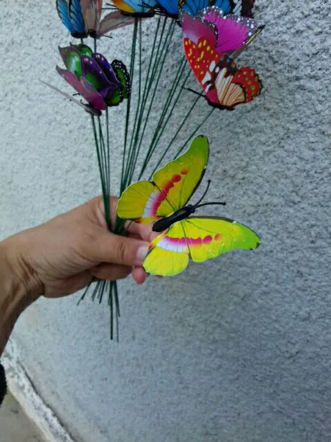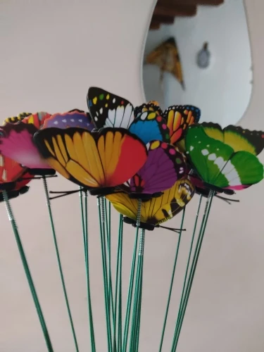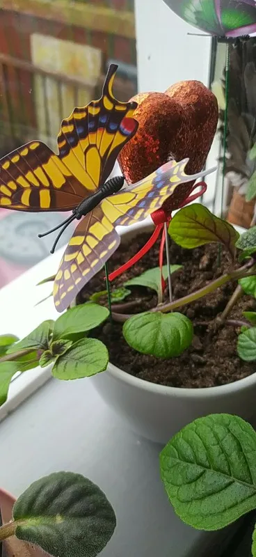 Бабочки неплохие, небольшие, примерно 4-5см, но прутья , на которые они закреплены очень тонкие, тоньше , наверное, чем зубочистки. В почву входят нормально, не гнутся. И , спасибо продавцу, отправил их, хотя бы , не сгибая прутья.