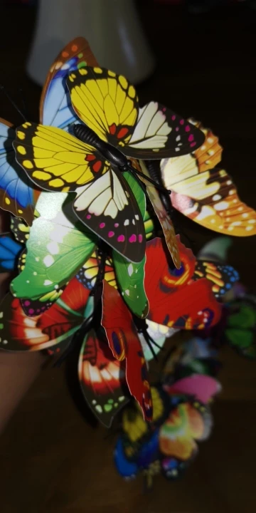 Яркие, симпатичные, милые бабочки. На конце палочки пружинка, на ней закреплена бабочка. Крылышки можно сложить или раскрыть в любой позиции. Были положены в обычный тонкий почтовый пакет без дополнительной упаковки. Но, на удивление, доставлены в абсолютной целостности, даже ни одна палочка не погнулась. Хотя, возможно, дело в том, что эта посылка была объединена с другими в одну большую. Всё хорошо. Спасибо.