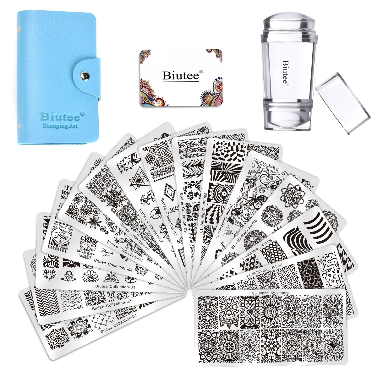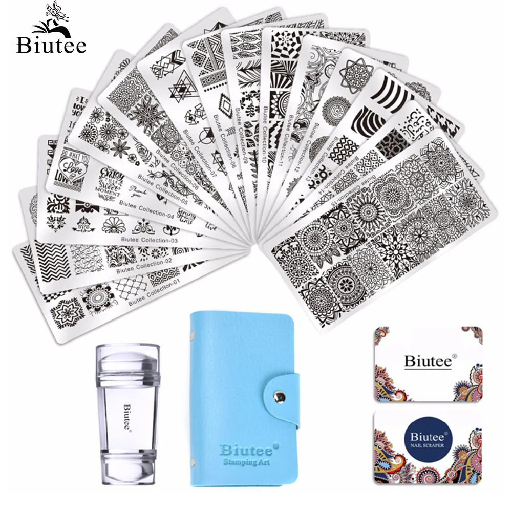 Набор пластин Biutee для дизайна ногтей, 19 шт., с изображением цветов, листьев, сердец, скребок, сумка для хранения ногтей, шаблоны для стемпинга