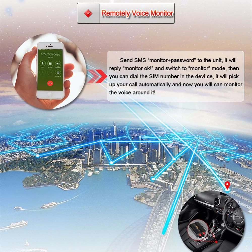 1. Переключение режимов «трек» и «Монитор»: по умолчанию используется режим «трек» (режим трека), если вы хотите контролировать голос вокруг устройства, отправьте трекеру «монитор + пароль» для переключения его в режим мониторинга, затем вы сделаете звонок на номер SIM в трекере, вы сможете контролировать голос вокруг него; Вы можете отправить «трекер + пароль», чтобы переключить устройство обратно в режим отслеживания.