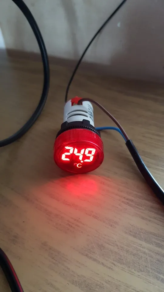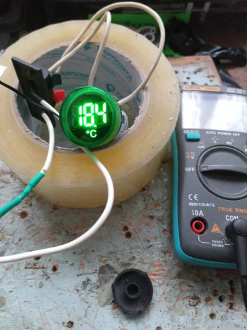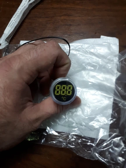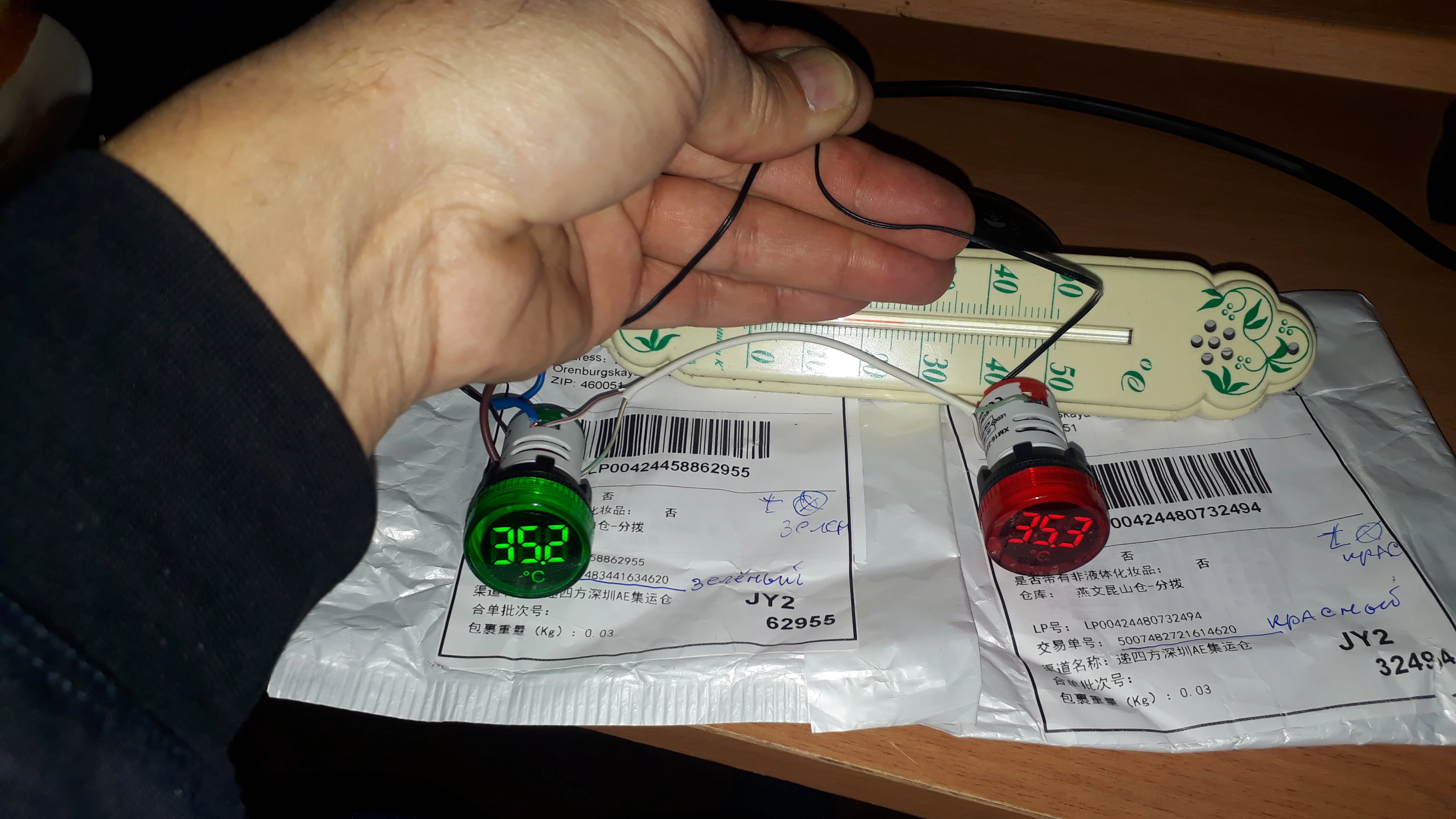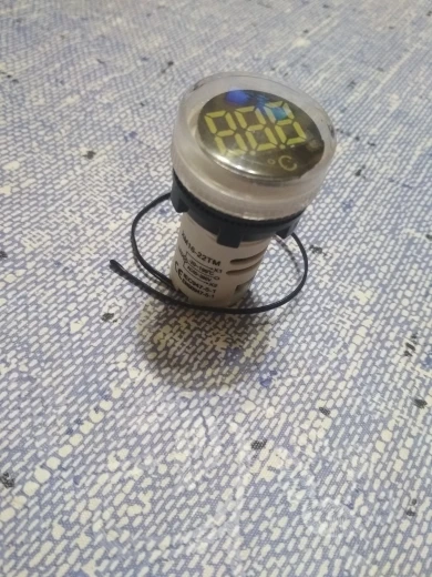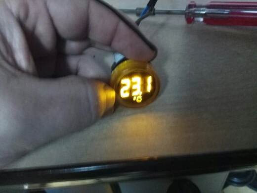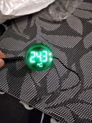 Брал один красный, по цене 108,24 руб. Прислали за 2 недели. Рабочая игрушка для гаража, индикатор включения сети потребителей и температура. Контактные зажимы корявые, хлипкие, но работают. Температура приблизительно совпадает с реальностью. Шустро реагирует на изменения. Фото в сравнении с другим продавцом (зеленый). Бытовой термометр. Другое фото, температура пальцев в руке. На улице, -0.1 совпадает с реальностью.