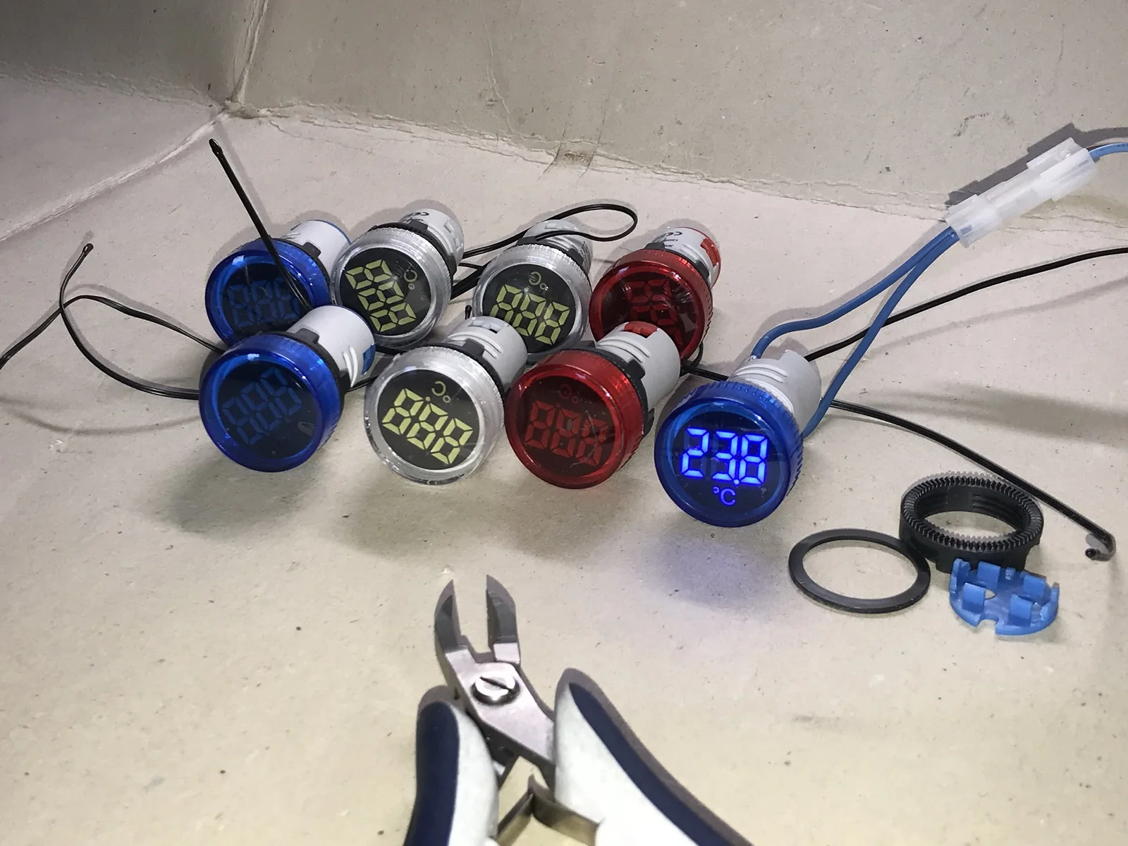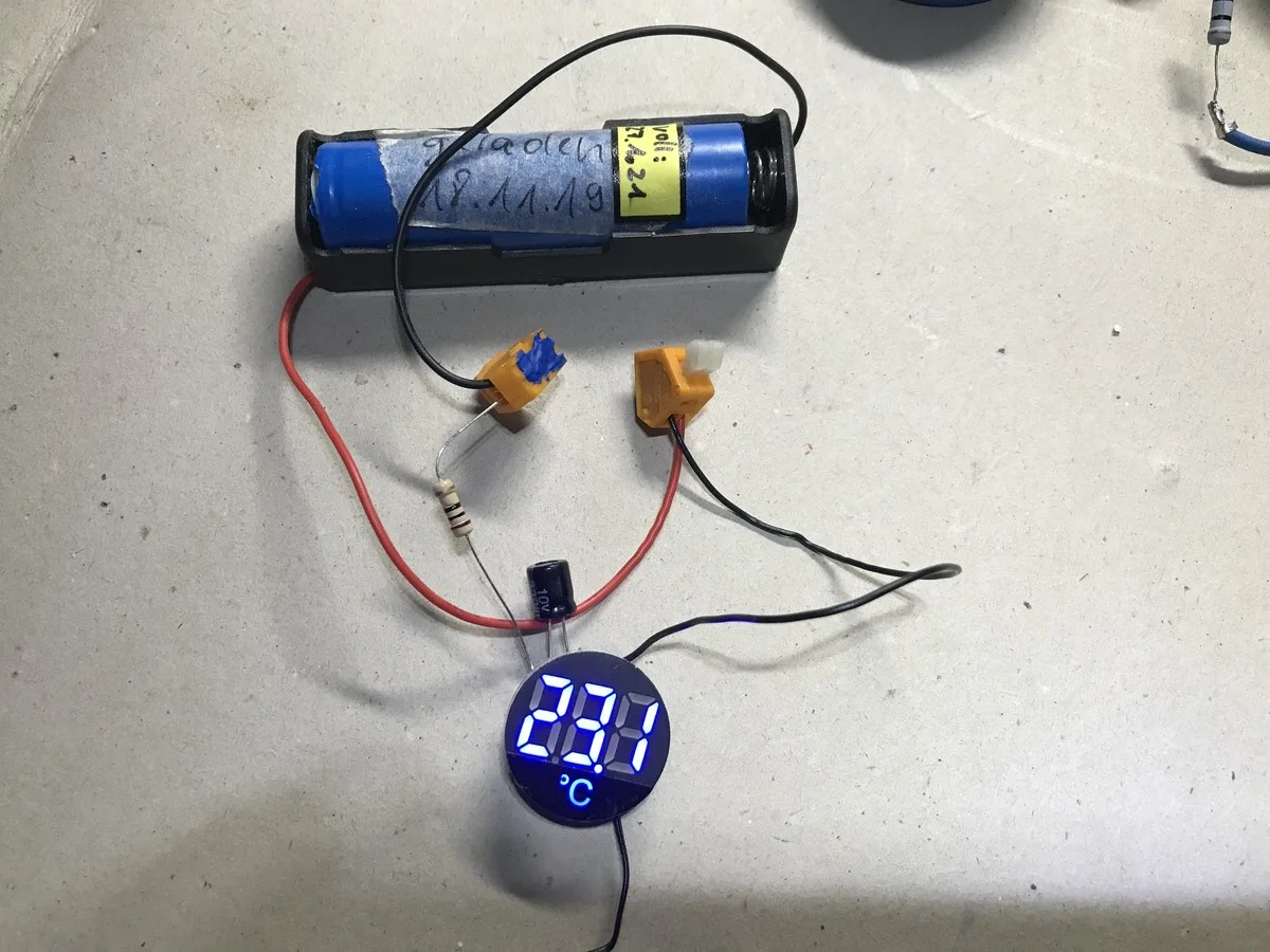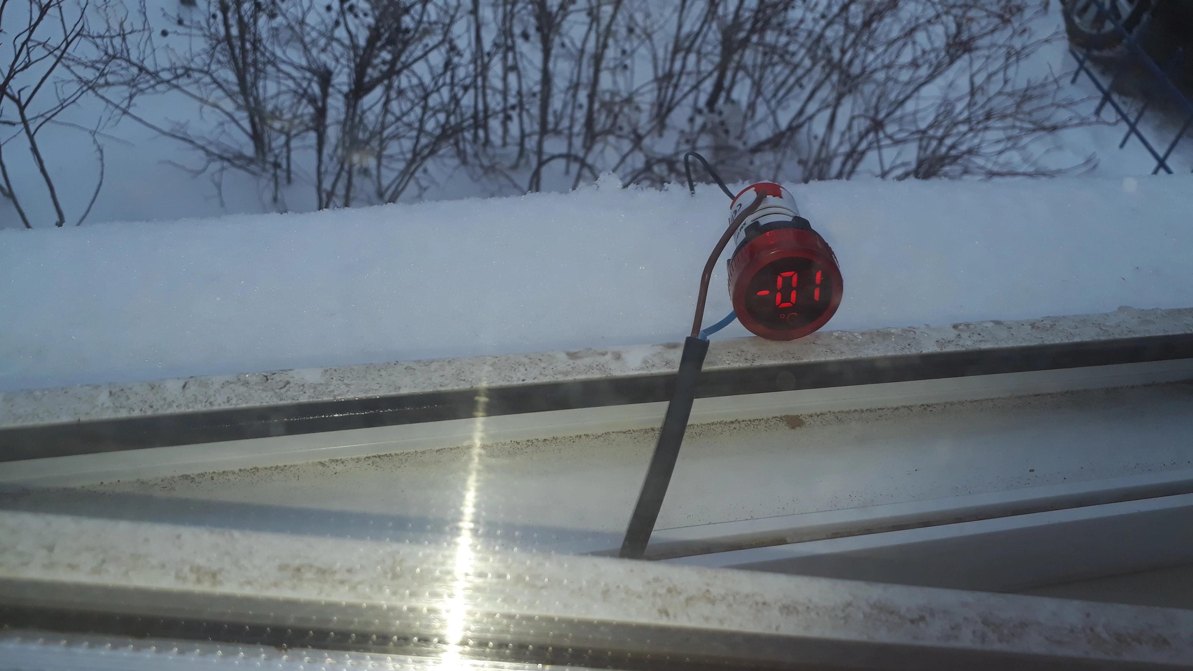 Брал один красный, по цене 108,24 руб. Прислали за 2 недели. Рабочая игрушка для гаража, индикатор включения сети потребителей и температура. Контактные зажимы корявые, хлипкие, но работают. Температура приблизительно совпадает с реальностью. Шустро реагирует на изменения. Фото в сравнении с другим продавцом (зеленый). Бытовой термометр. Другое фото, температура пальцев в руке. На улице, -0.1 совпадает с реальностью.