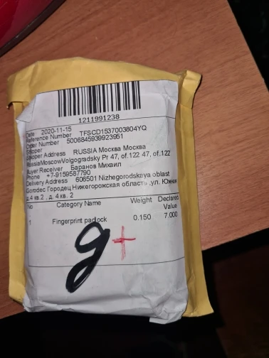 Очень быстро доставили мой заказ! 8 дней отслеживался, 5 дней в пути. Доставили СДЕК-ом. Замок хорошего качества, несколько больше размером, чем я ожидал! Прекрасно програмируются отпечатки пальцев, теперь не нужен ключ. Рекомендую к покупке данный товар!