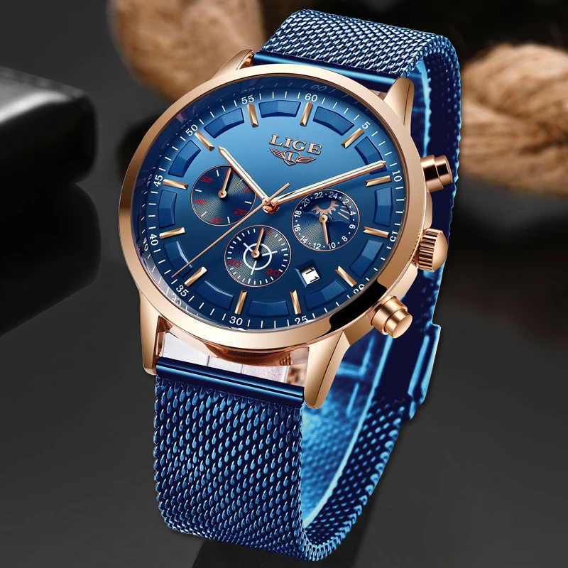 Часы наручные LIGE Мужские кварцевые, модные брендовые Роскошные повседневные спортивные водонепроницаемые из нержавеющей стали, синие