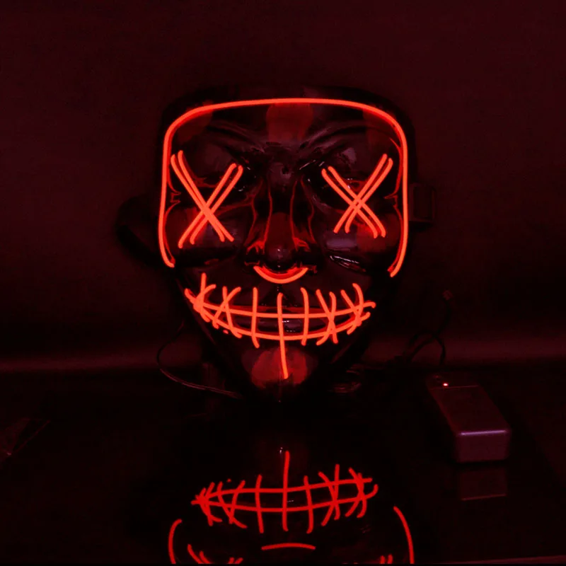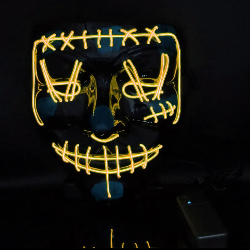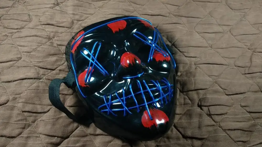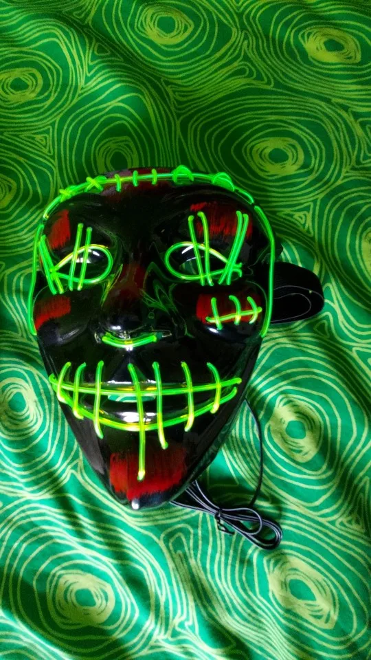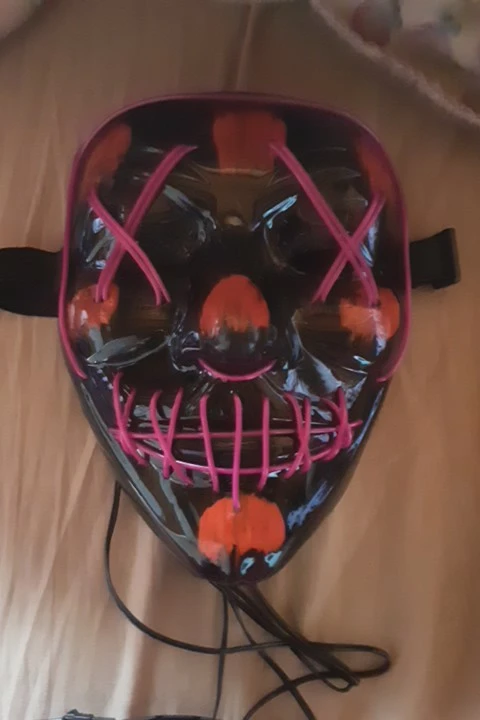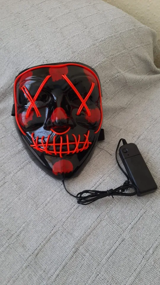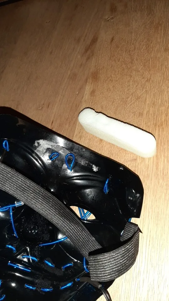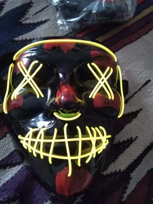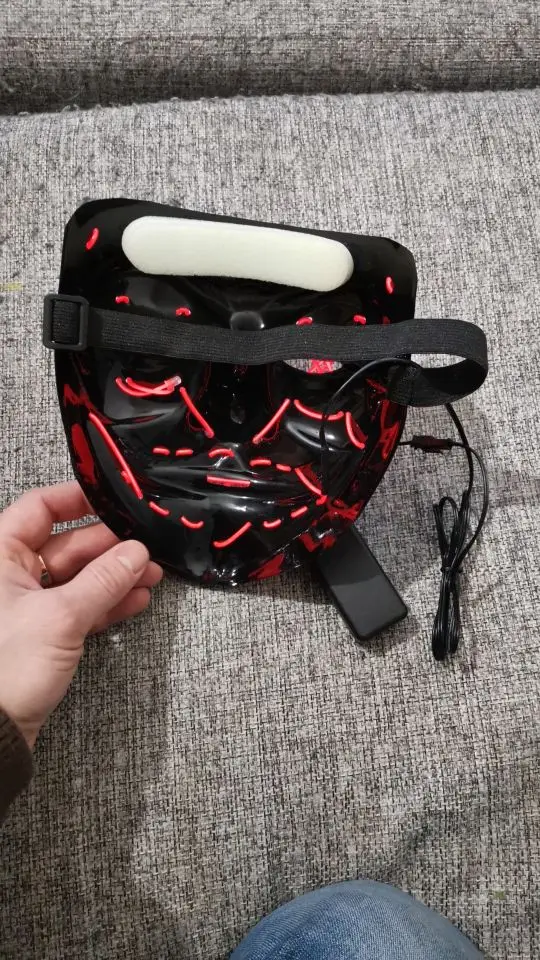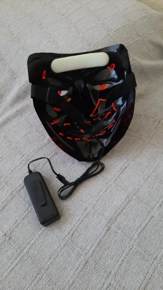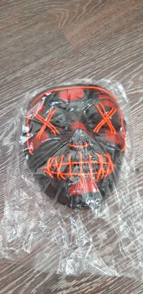 Маска очень классная, неон качественный, пластик не воняет. В лобной части маски, с внутренней стороны, имеется паралоновая прокладка, для удобства ношения. Неон пищит! Батареек в комплекте нет. Доставка очень быстрая, буквально 12 дней до Сибири.