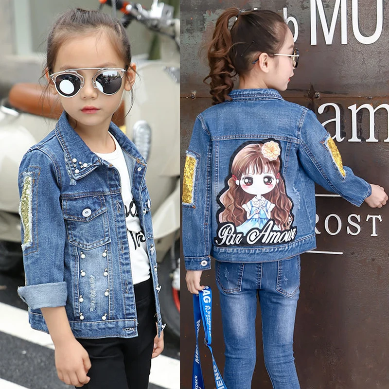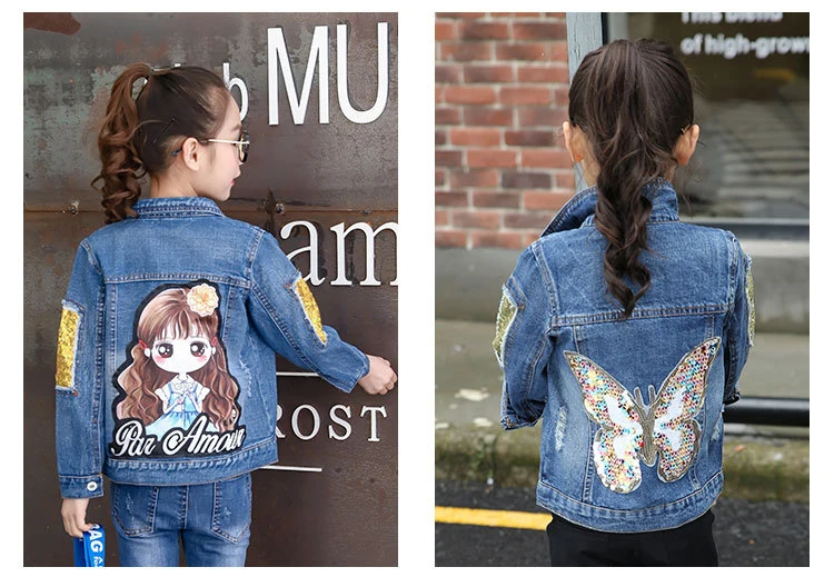 Осень 2019, джинсовая куртка для девочек, модная детская джинсовая куртка с мультяшными блестками, Детская ветровка в стиле пэчворк, верхняя одежда для малышей на весну