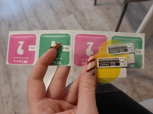В красном пакетике влажная салфетка, в зелёном сухая. У наклейки лепесток, который пришлось отрезать вручную. Клеится слабо, с пузырями, одна ушла на выброс