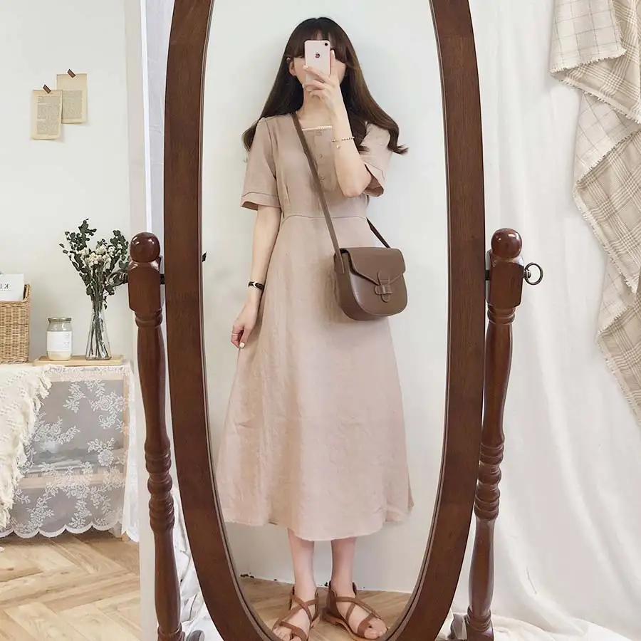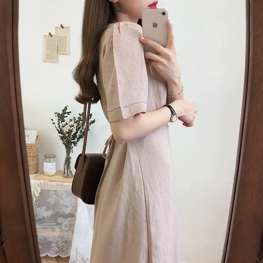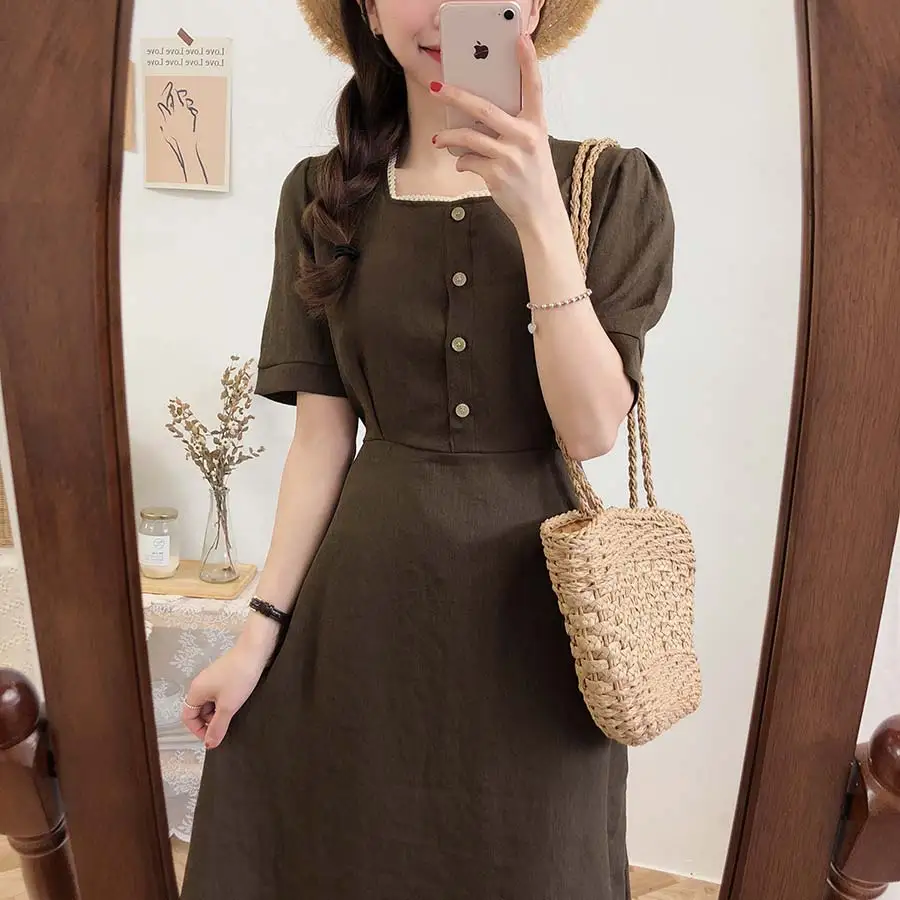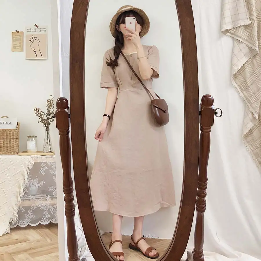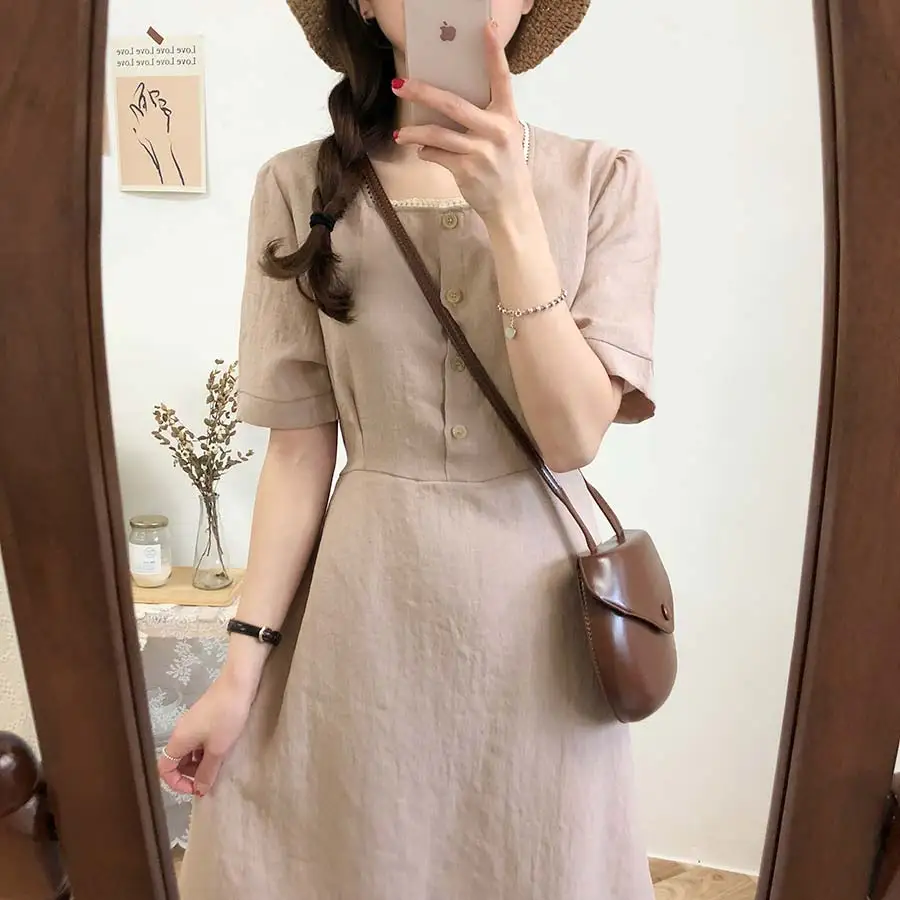 Винтажные милые платья, длинные женские летние повседневные платья с коротким рукавом в консервативном стиле трапециевидной формы из Рубашка-Платье на пуговицах хлопка и льна, 5127