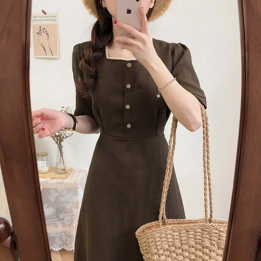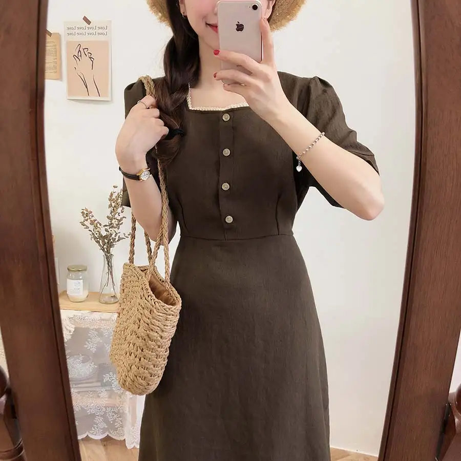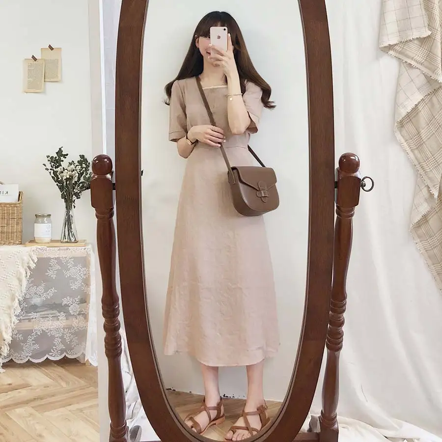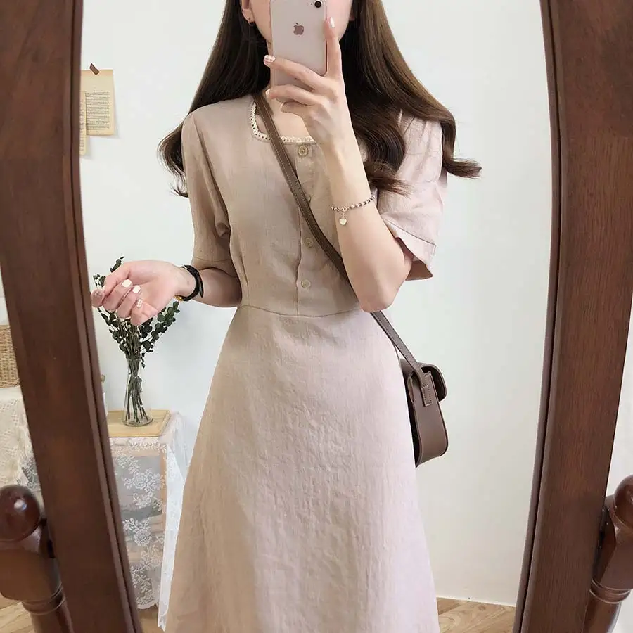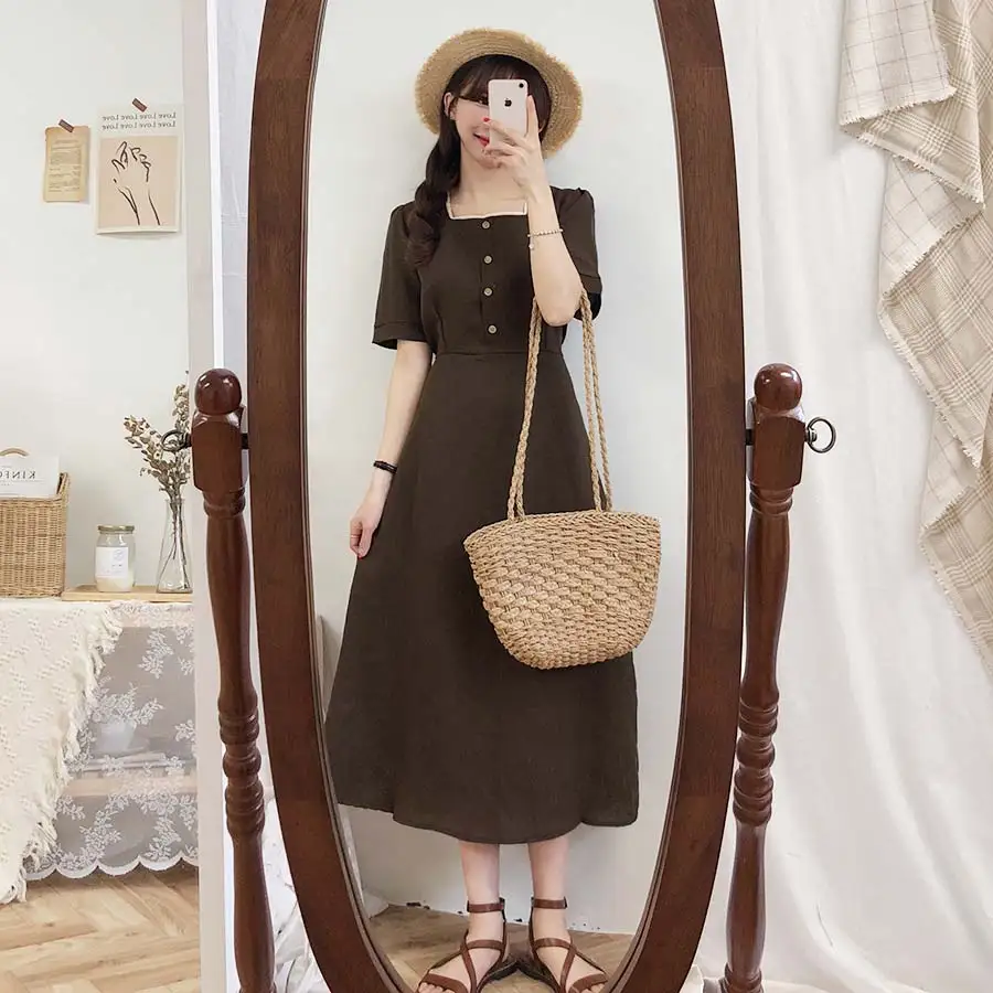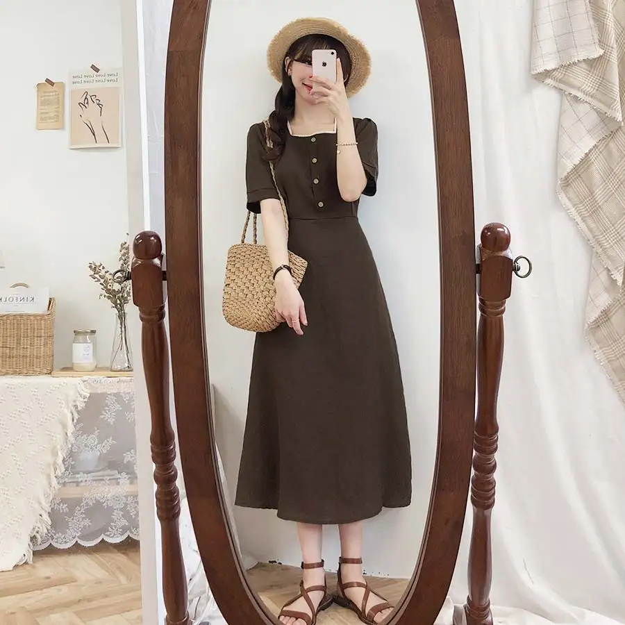 Винтажные милые платья, длинные женские летние повседневные платья с коротким рукавом в консервативном стиле трапециевидной формы из Рубашка-Платье на пуговицах хлопка и льна, 5127