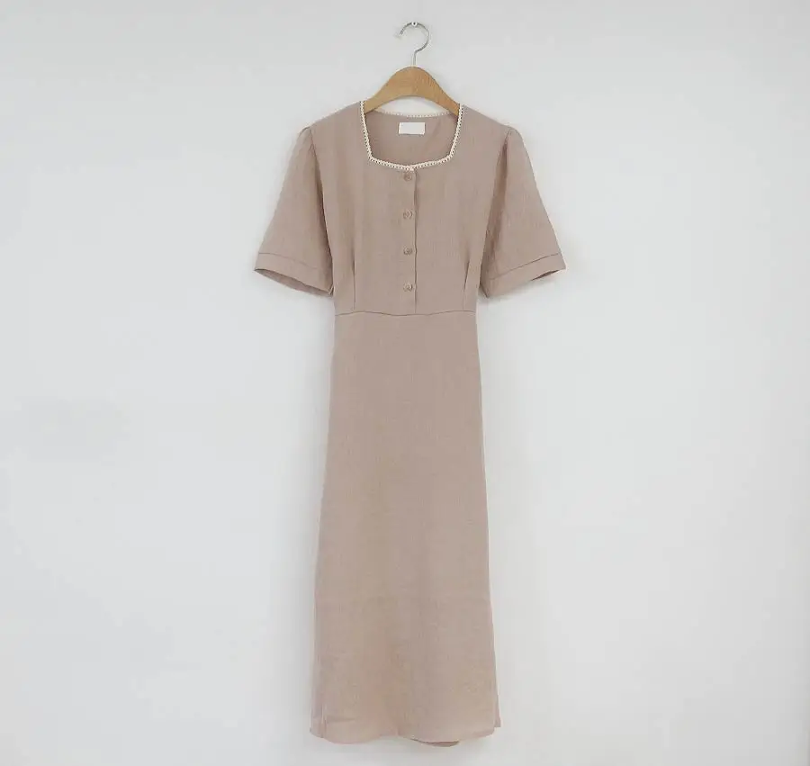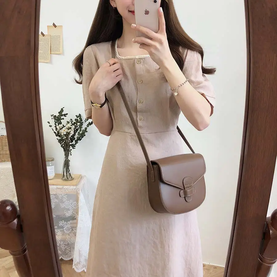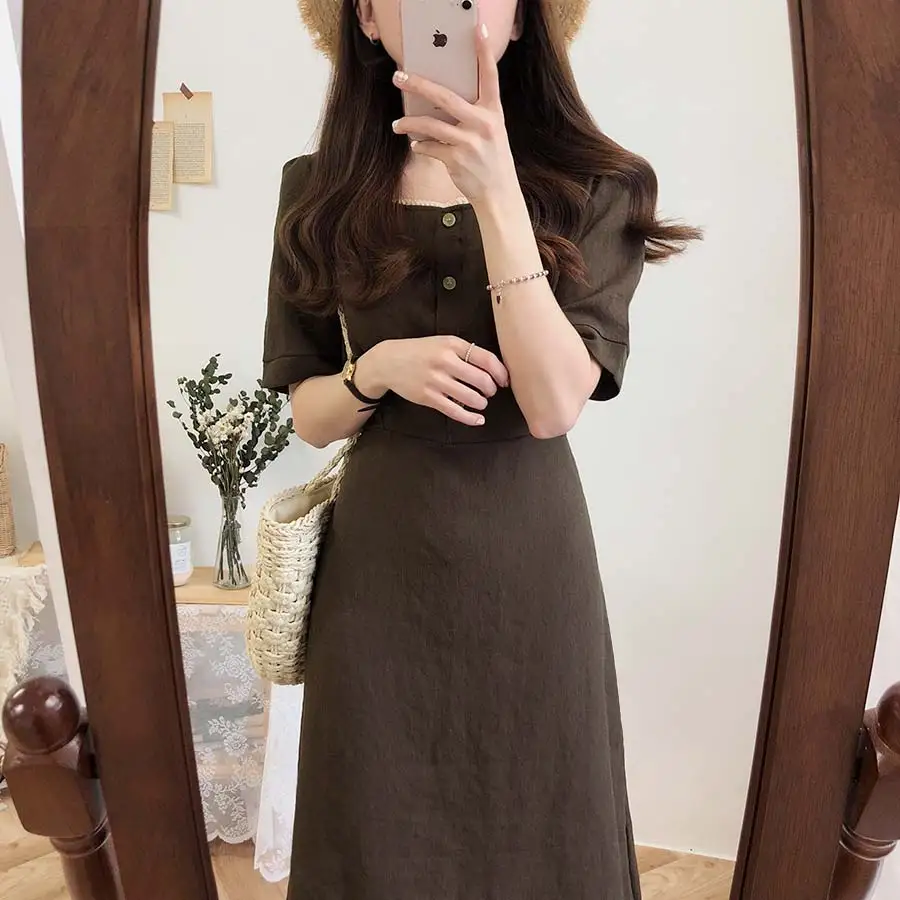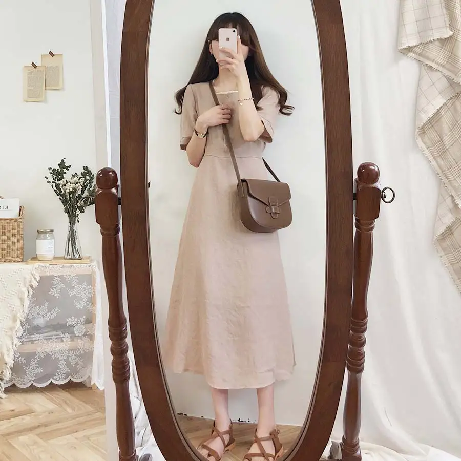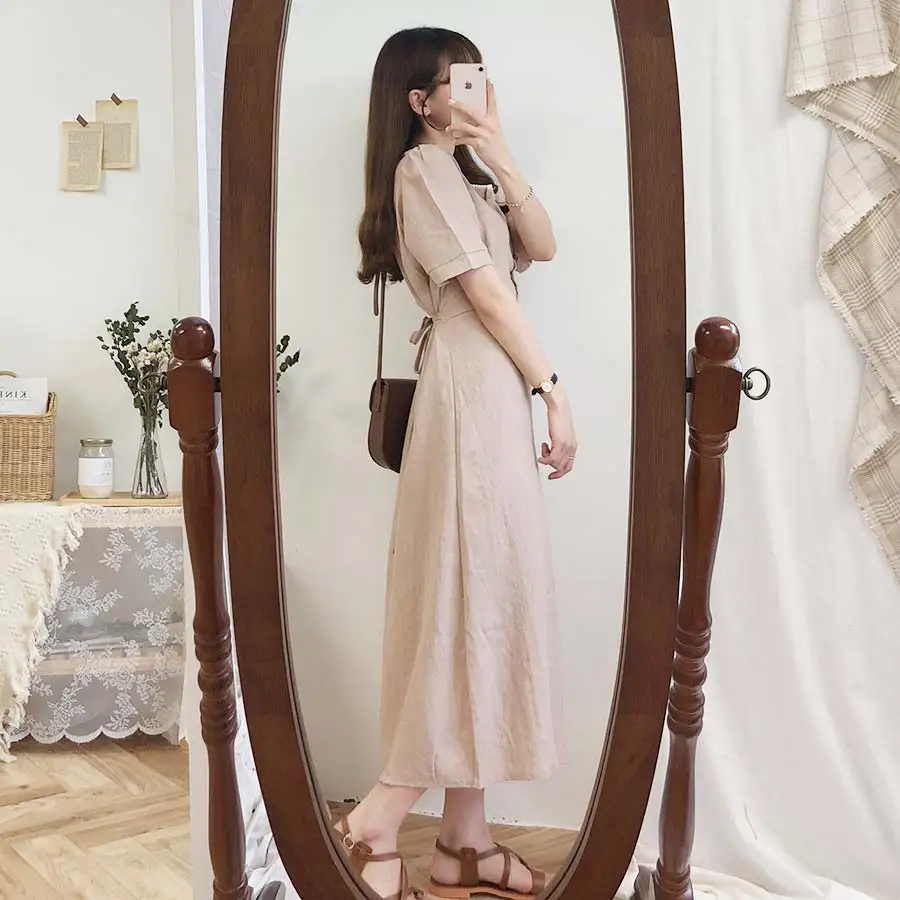 Винтажные милые платья, длинные женские летние повседневные платья с коротким рукавом в консервативном стиле трапециевидной формы из Рубашка-Платье на пуговицах хлопка и льна, 5127