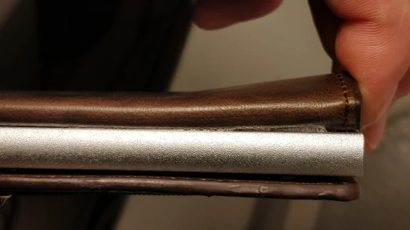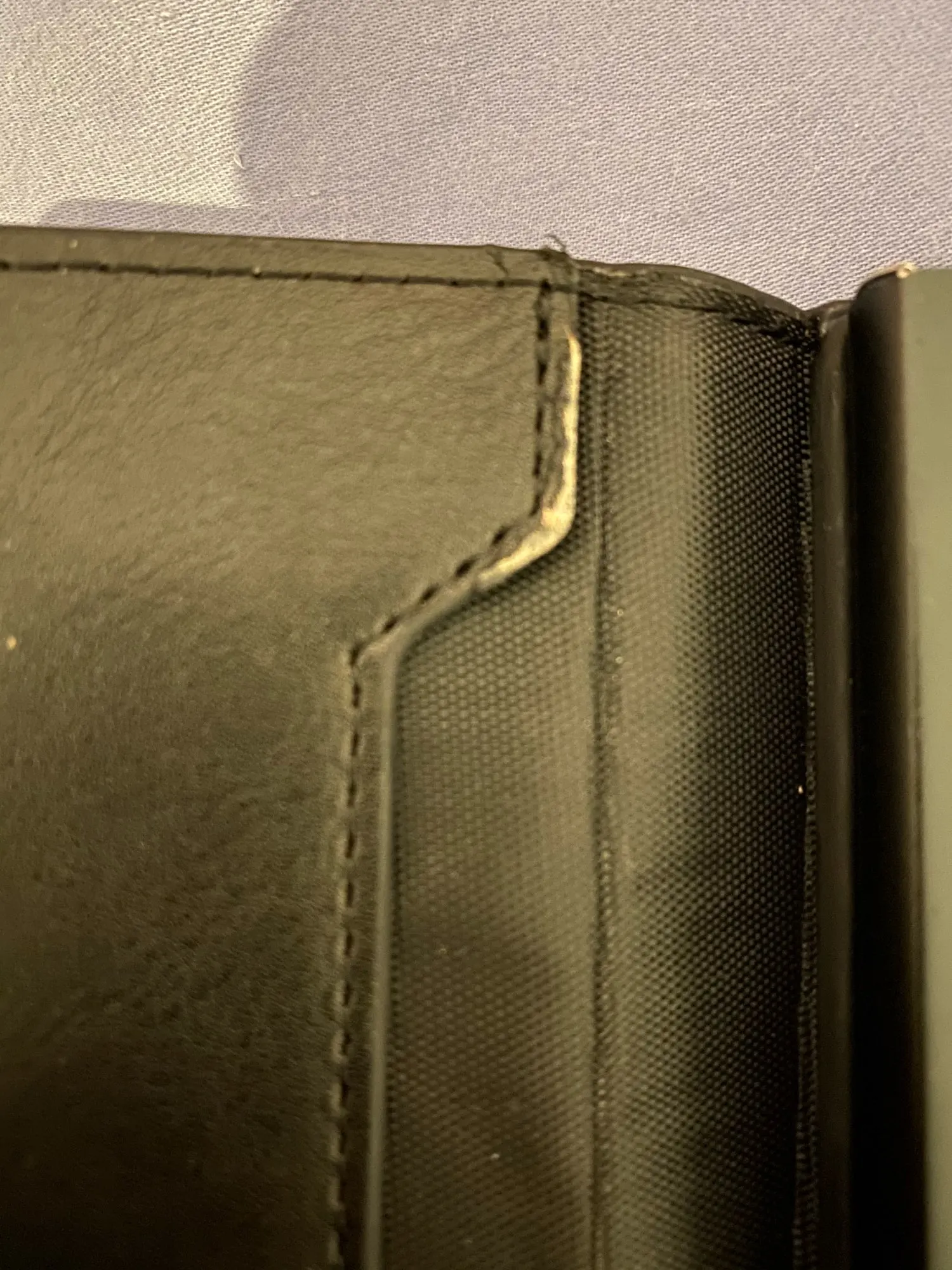 Это не потянет карты легко, я должен нажать его действительно трудно. Кроме того, если вы положите больше карт в боковые карманы, почти невозможно сложить бумажник.