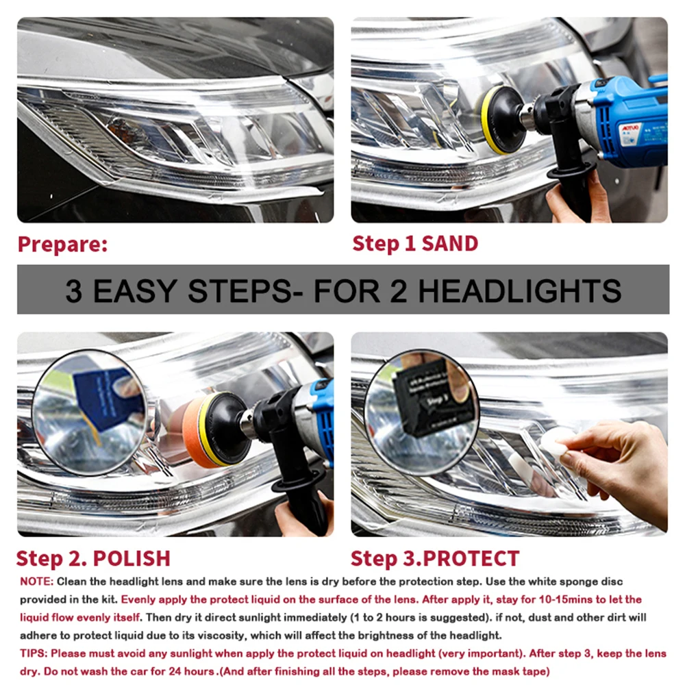 Подготовка: Очистите линзу фары водой. Снимите маску с окружающего периметра линзы, чтобы не царапать краску автомобиля. Два способа выбора: руководство или машина Машинная полировка, как правило, дает лучшие результаты. Step1. Песок Намочите шлифовальный диск и прикрепите его к задней панели. Песок с тремя разными кругами полностью удаляет тяжелые пожелтения, выцветание и коррозию. Примечание: Используйте шлифовальные диски от грубой до тонкой: P800 --> P1200--P2000. Если этого не сделать, это приведет к сбою восстановления Step2. Польский Прикрепите диск с оранжевой губкой к подушечке и нанесите полировочную пасту. Отполируйте линзу до тех пор, пока блеск не восстановится в первоначальном состоянии. Примечание: Для достижения наилучших результатов используйте электрический буфер или полировщик. При полировке вручную отполируйте не менее 200 ударов круговыми движениями по часовой стрелке. Step3.Protect Очистите линзу фары и убедитесь, что линза высохла, прежде чем продолжить этот шаг. Убедитесь, что фара не находится под прямыми солнечными лучами (очень важно). С помощью белого губчатого диска, предоставленного в комплекте, равномерно нанесите слой защитной жидкости на поверхность линзы. Оставьте защитную жидкость на месте и высушите в течение 15 минут. Затем дайте жидкости вылечиться при прямых солнечных лучах в течение 1-2 часов. После шага 3 Держите линзу сухой и не допускайте попадания влаги. Не мойте автомобиль в течение 24 часов.