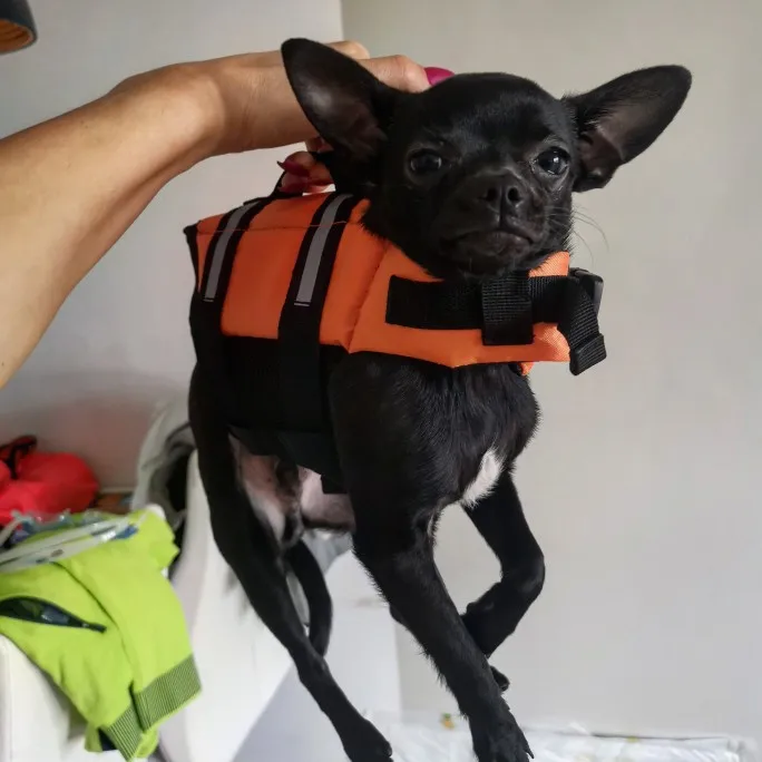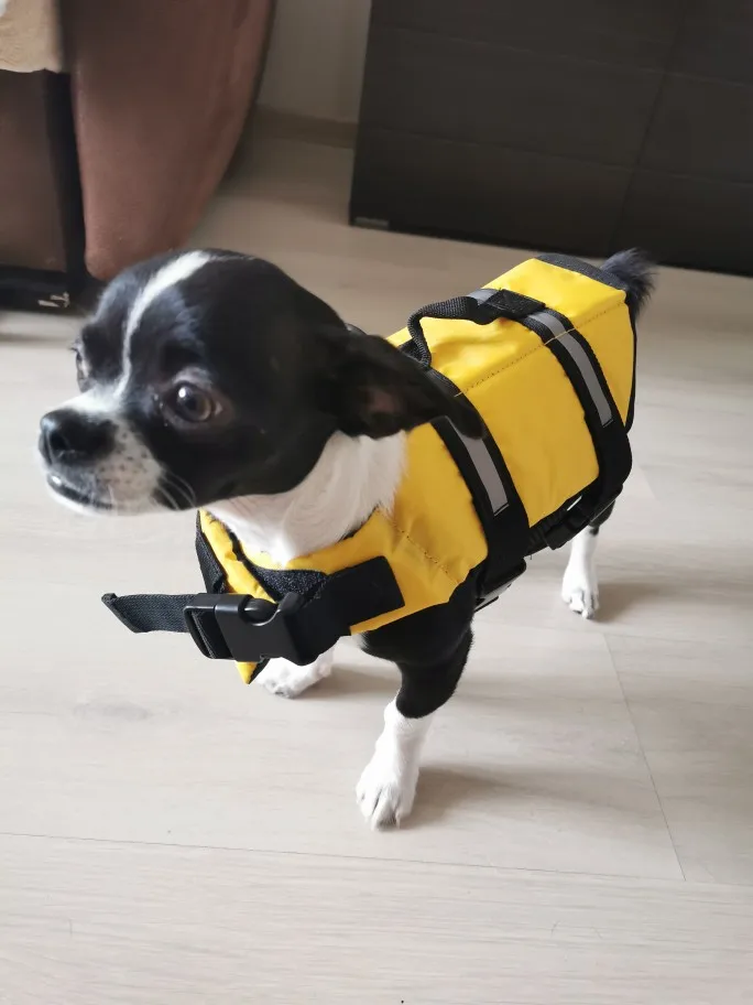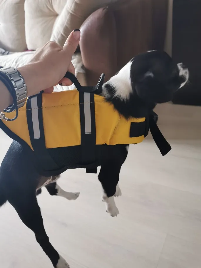 Жилет отличный, качественно сшит, прочный. Брала на чихуа 3,5кг с параметрами 28см спина, 40см грудь, 26-28см шея. Не смотрите на длину спины, берите по обхвату шеи и груди. Он сидит не по всей длине спины, по груди подошёл отлично. Застёгивается на липучке + сверху доп фиксация фастексами. Регулировка присутствует. Порадовала цена, брала со скидкой. Также есть ручка и кольцо для поводка. Брала для занятий плаванием) когда испытаем, дополню отзыв