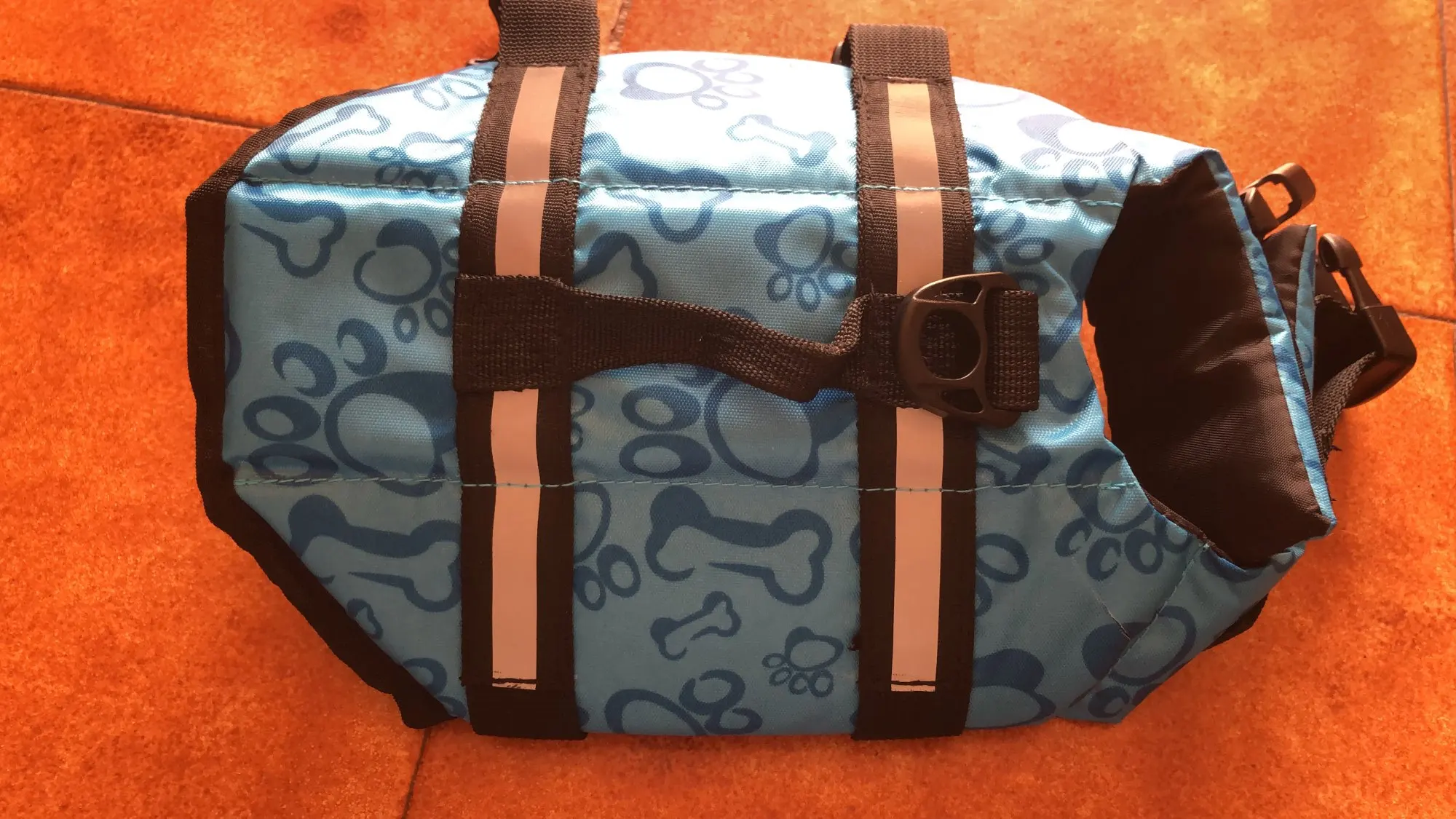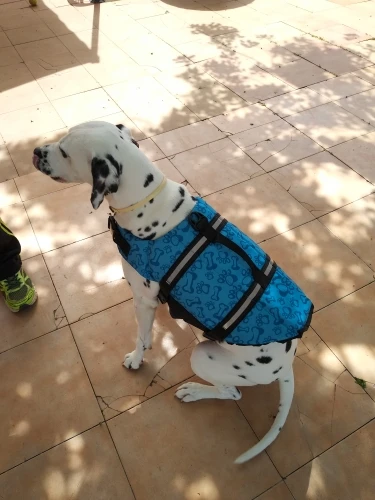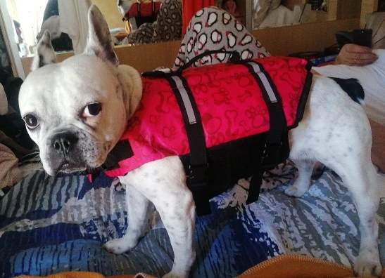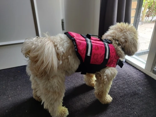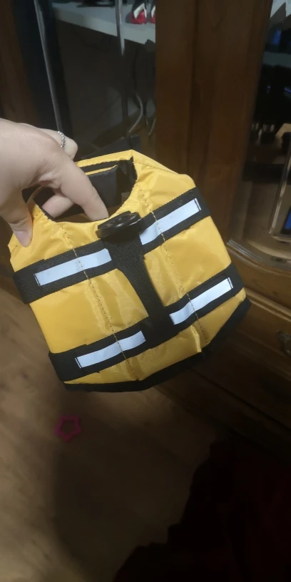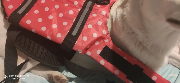 жилет красивый. пошит качественно. брала размер xxl для собаки 60 кг, которая в воду заходит, но плавать боится. жилет не держит собаку на воде, собака не лежит на поверхности, а также как и без жилета тело погружается в воду на столько, что уверенности собаки совершенно не придает.