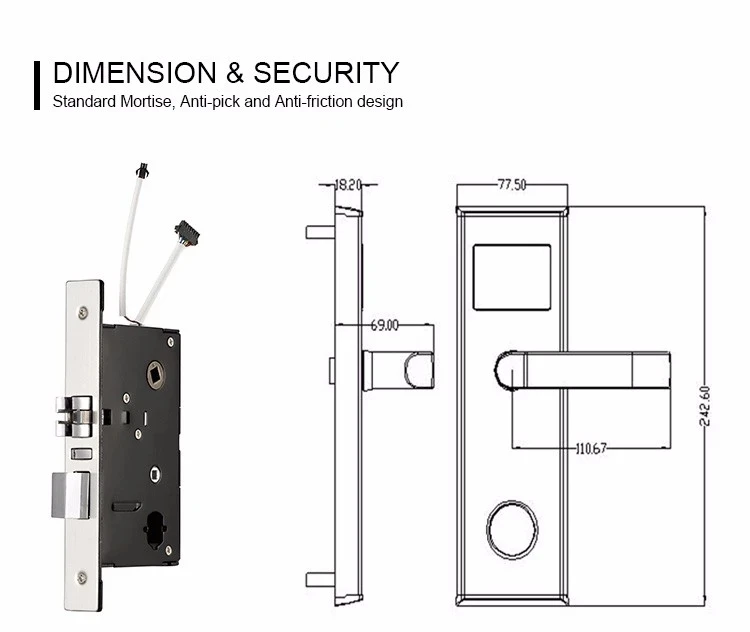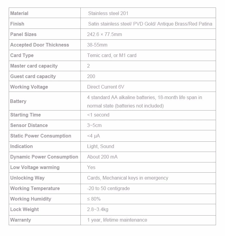 1. 304 материал из нержавеющей стали2. Универсальный для правого или левого направления и открывания3. Безопасная конструкция ручки для защиты любого прорыва и прохождения 300 тысяч испытаний времени.4. Скрытая Механическая Замочная скважина, вставьте батареи мертвыми, так что вы можете использовать ключ, чтобы открыть дверь.5. Заглушка конфиденциальности внутри двери, чтобы обеспечить двойную безопасность.6. Приведенный в действие 4 шт. 1,5 V Alkline аккумулятор и зарядное устройство, которое может быть длится около 1 год.Там будет низкие батареи сигнализации в тех случаях, когда батареи ниже, чем 4,8 V, для того, чтобы устройство напомнит вам о необходимости замены старых батарей.