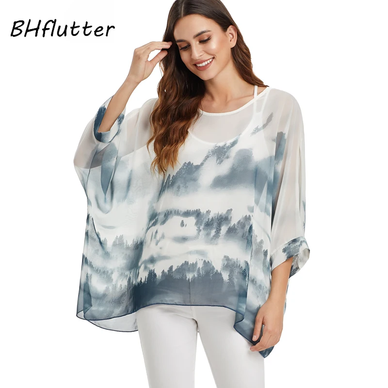 Блузка женская шифоновая, с принтом, летняя, белая, размера плюс
