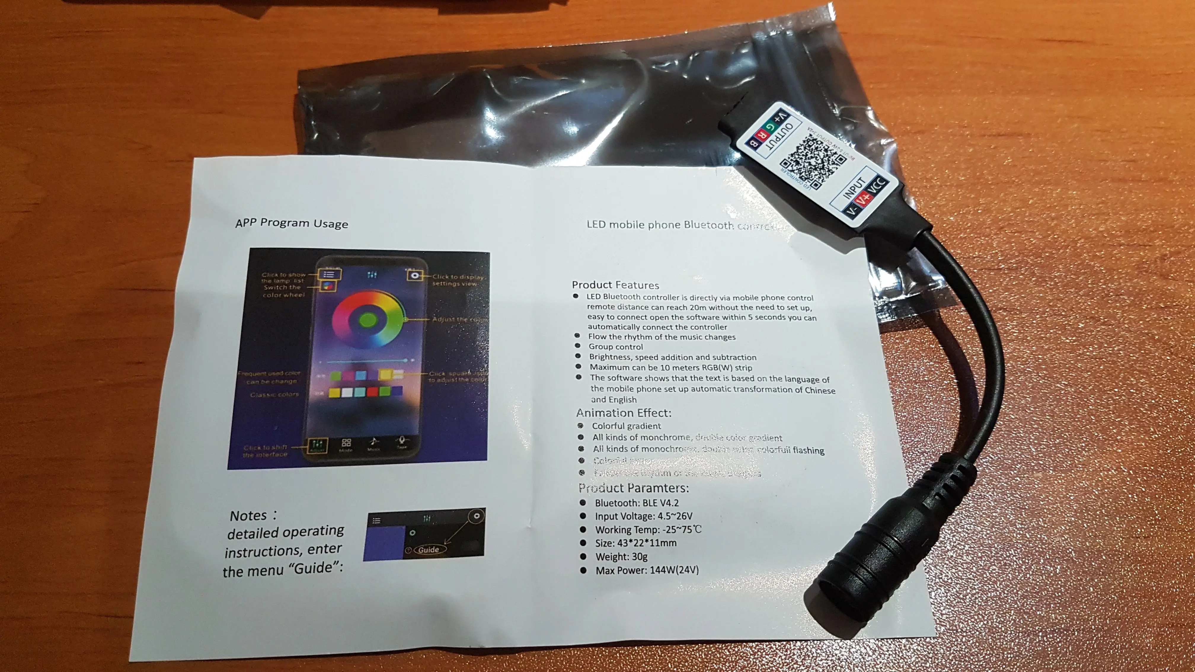 Отличный продавец, отличный товар! Дошло за 14 дней до Тверской области! Всё супер! Спасибо за вашу работу!!! Приложение устанавливается по QR коду, работает по блютуз. Все режимы работают, даже есть прикольный режим подсветки под музыку!