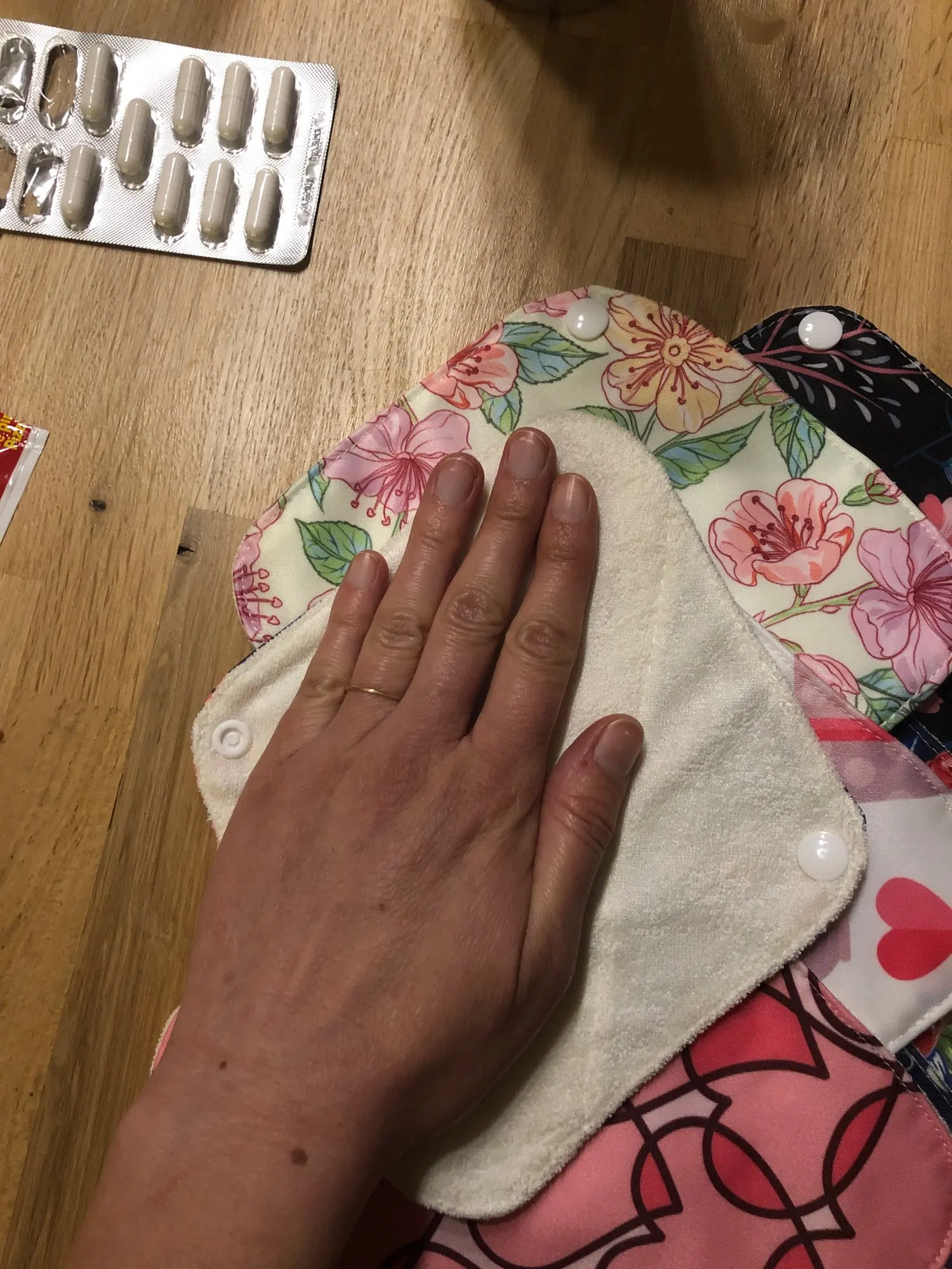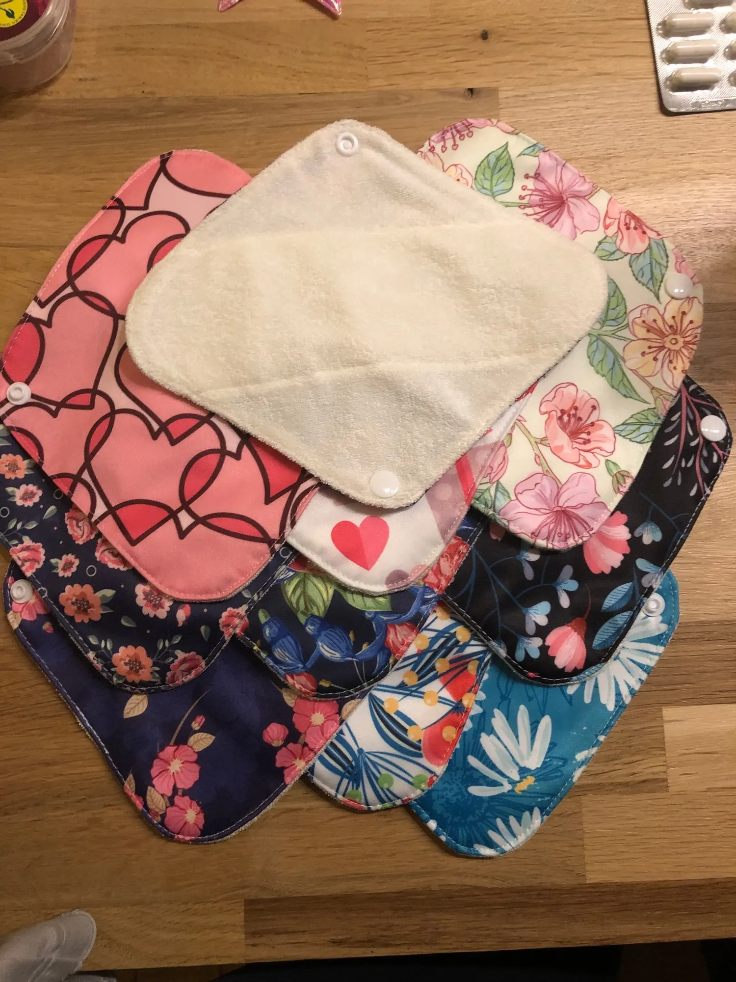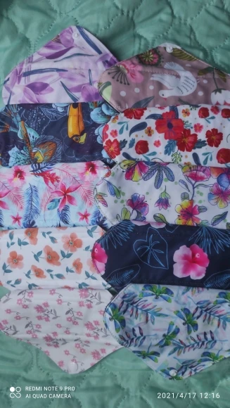 Посылка прибыла в Киев за 17 дней (мист экспресс). Расцветки мне очень нравятся. До этого набора пользовалась прокладками с нательной стороной из черного бамбука (типа флиса). Белая же поверхность - кажется натуральной тканью, но вместе с этим кажется тактильно жестковатой. Флис вот прям явно мягче, приятней. На практике пока не испытала. Потому дополню отзыв позже.