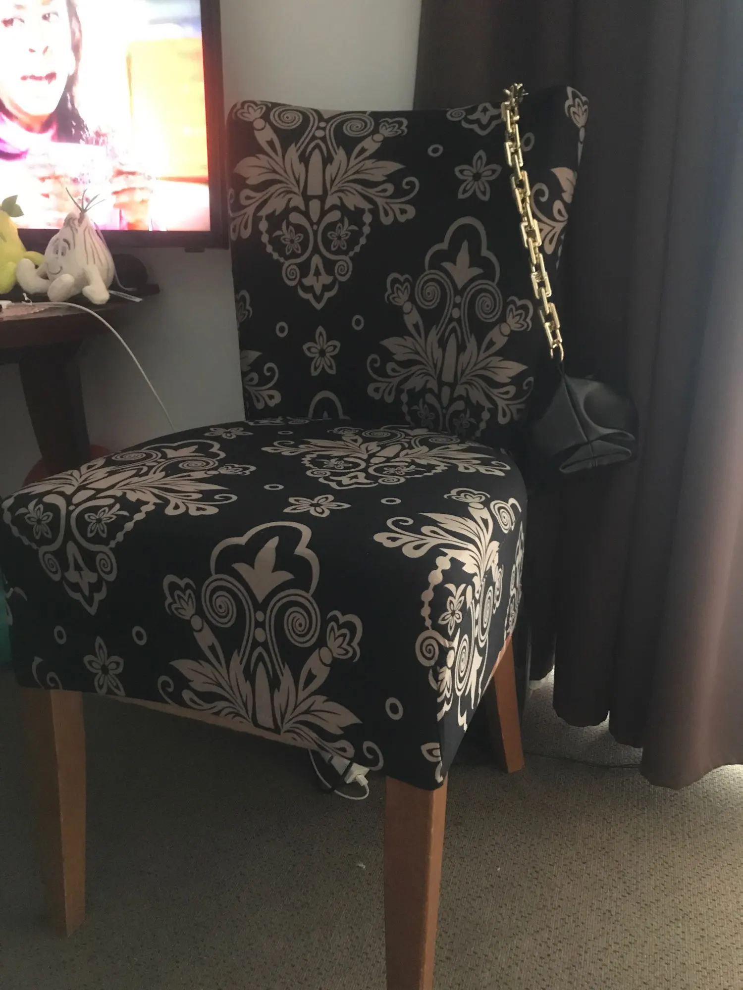 Я немного беспокоился, так как мои стулья черные, но это прекрасно их покрывает. Вы не видите темное кресло. Ткань плотная. Отличная покупка!