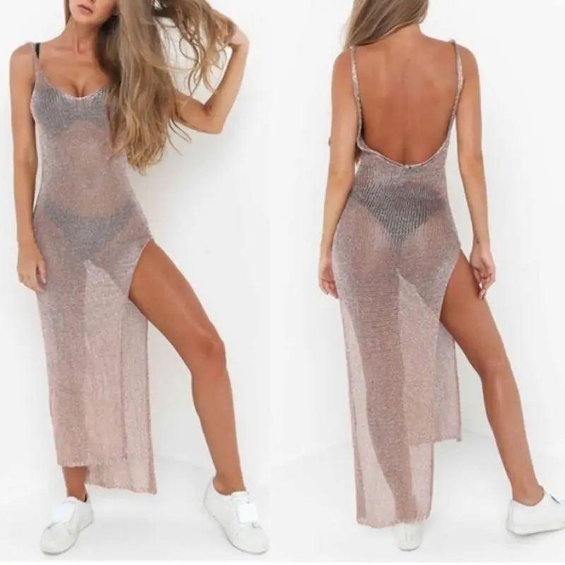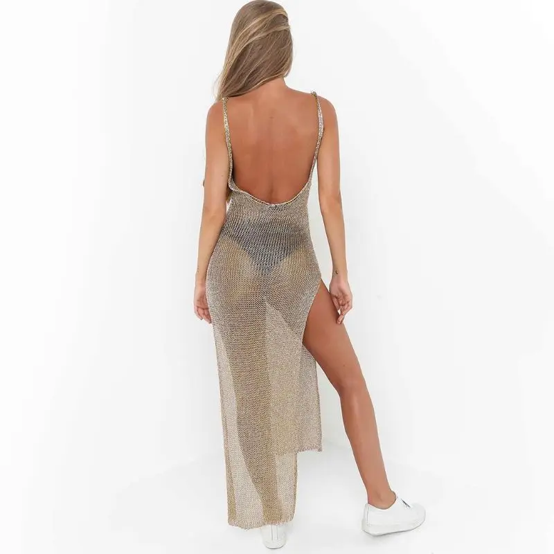 Женское пикантное летнее солнцезащитное прозрачное Сетчатое бикини, накидка с металлическим блеском, однотонное пляжное Клубное вечернее платье без рукавов с открытой спиной и высоким разрезом
