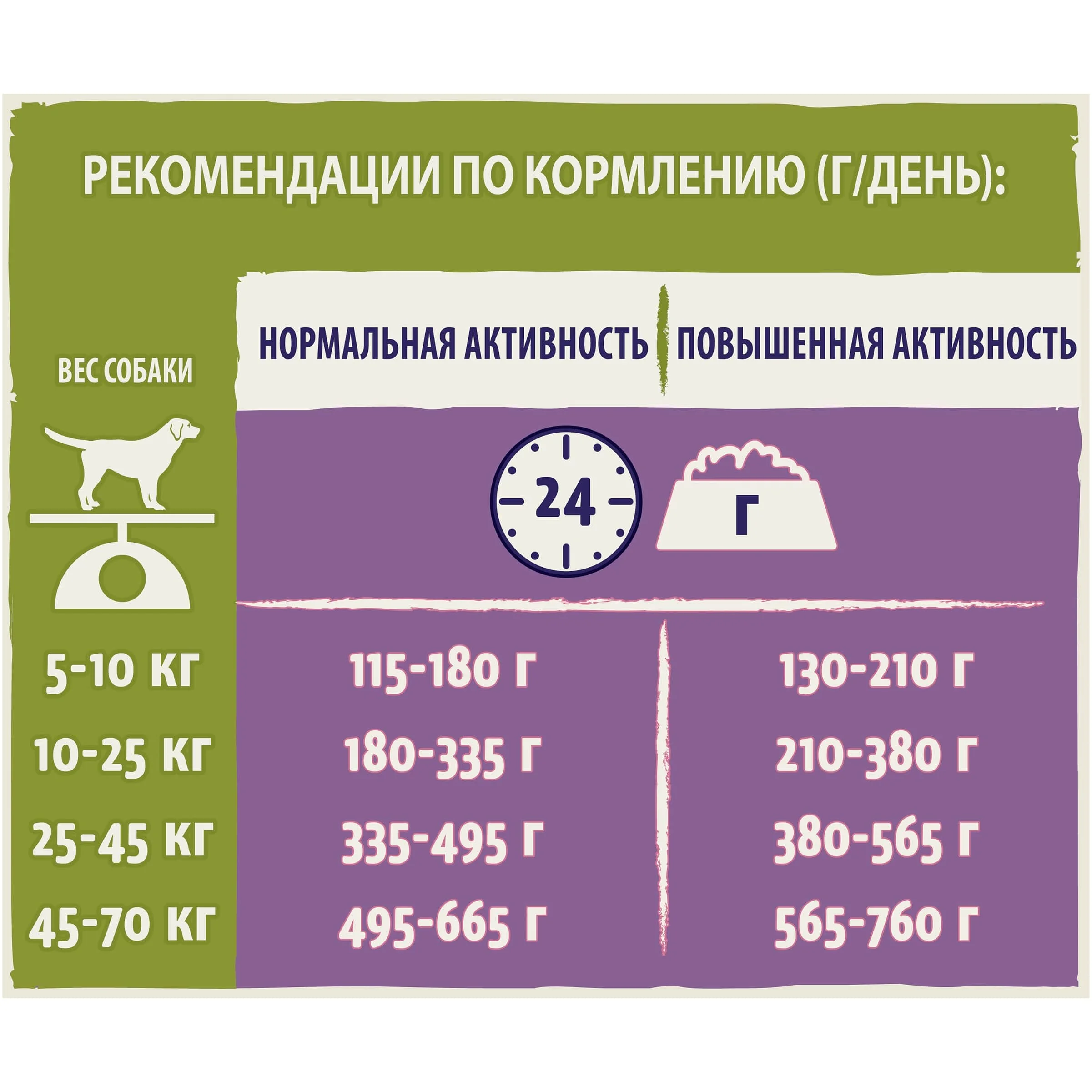 Рекомендации по кормлению: Для определения нормы кормления см. таблицу. Приведенные в таблице данные являются ориентировочными. Корректируйте суточную норму кормления в соответствии с уровнем активности, упитанностью и индивидуальными потребностями Вашей собаки. Собака всегда должна иметь доступ к чистой свежей питьевой воде. Регулярно посещайте ветеринарного врача для контроля состояния здоровья Вашего питомца. Переводите собаку на корм DOG CHOW® постепенно в течение 7 дней.