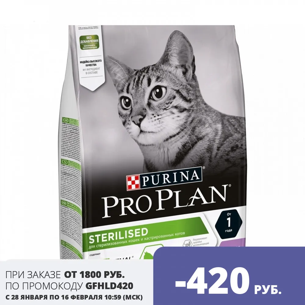 Сухой корм Purina Pro Plan для стерилизованных кошек и кастрированных котов, с индейкой, Пакет, 3 кг