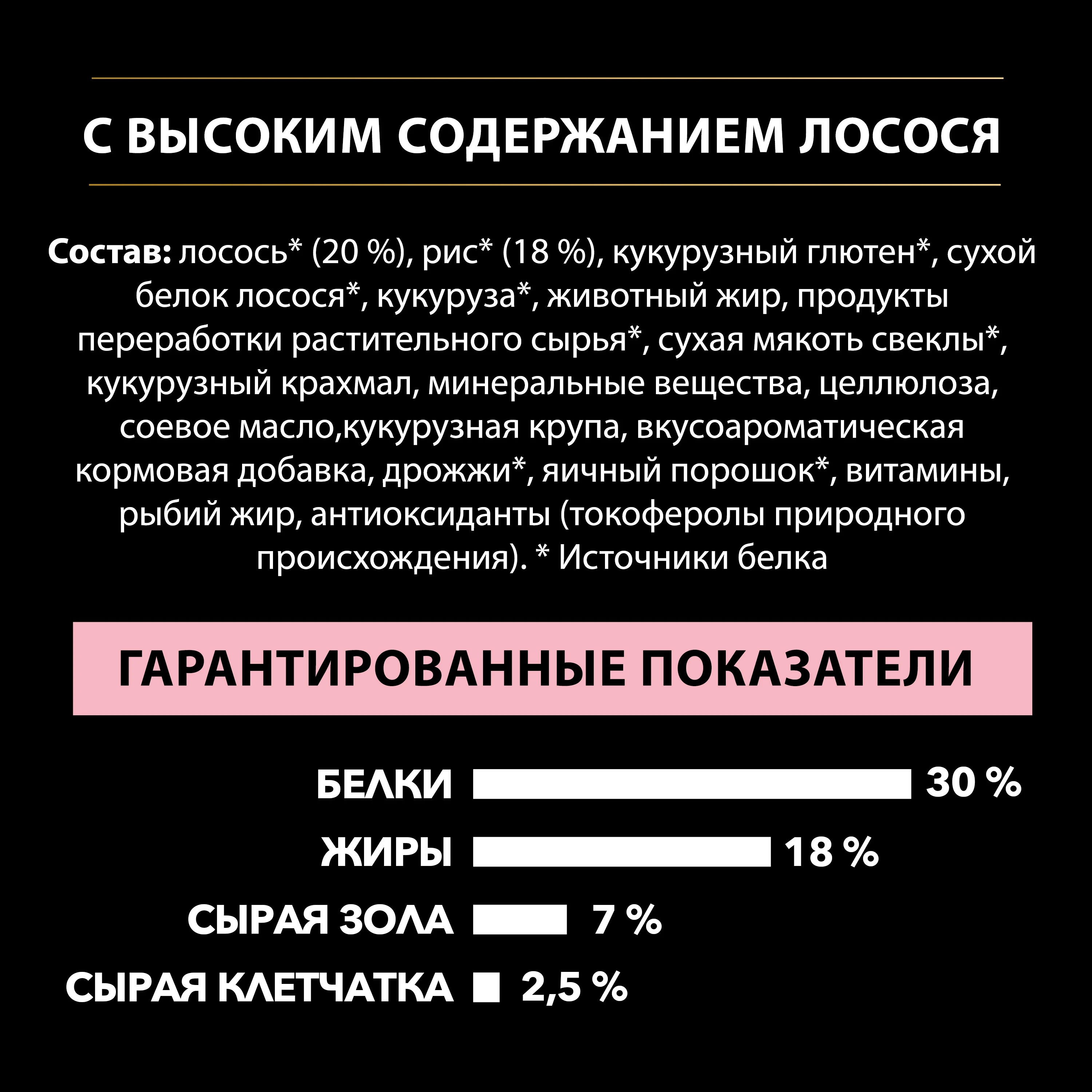 Разработанный нашими ветеринарами и диетологами корм Purina® PRO PLAN® с комплексом OPTIDERMA® обеспечивает улучшенное питание, которое поддерживает чувствительную кожу взрослых собак. Подтверждено, что OPTIDERMA® включает в себя специальную комбинацию питательных веществ, которые поддерживают здоровье кожи и красивую шерсть, а отобранные источники белка помогают сократить возможные кожные реакции, связанные с пищевой чувствительностью. Преимущества: • Специально отобранные источники белка для собак с чувствительной кожей • Сочетание основных питательных веществ, которое помогает поддерживать здоровье суставов вашей собаки при активном образе жизни • Клинически подтверждено: поддерживает здоровье кожи • Содержит высококачественный белок из лосося Рекомендации по кормлению: Для определения нормы кормления см. таблицу. Указанные нормы рекомендованы для поддержания собаки в оптимальной физической форме. Меняйте суточную норму кормления в зависимости от уровня активности собаки, ее физических особенностей и индивидуальных потребностей. Следите, чтобы у собаки всегда была чистая, свежая питьевая вода. Для контроля здоровья вашей собаки обращайтесь в ветеринарную клинику на регулярной основе. Состав: Лосось* (20%), рис* (18%), кукурузный глютен*, сухой белок лосося*, кукуруза*, животный жир, продукты переработки растительного сырья*, сухая мякоть свеклы*, кукурузный крахмал, минеральные вещества, целлюлоза, соевое масло,кукурузная крупа, вкусоароматическая кормовая добавка, дрожжи*, яичный порошок*, витамины, рыбий жир, антиоксиданты (токоферолы природного происхождения). * Источники белка. Страна производства: Россия Условия хранения: В сухом прохладном месте