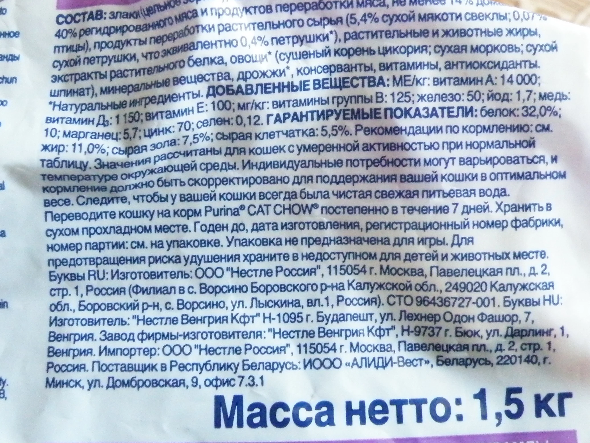 Ваша кошка — уникальное создание.Чтобы она продолжала радовать вас, Purina создала корм Cat Chow® - корм с качественным белком и натуральными ингредиентами (петрушка, шпинат, морковь, цельные зерна злаков, цикорий и дрожжи).Он отличается высоким содержанием домашней птицы и включает Naturium® -особое сочетание волокон из натуральных источников, а также источник натурального пребиотика, который поддерживает здоровое пищеварение кошки. Это позволяет ей питаться с большей пользой. Основываясь на нашей экспертизе с 1926 года, мы разработали полнорационный, сбалансированный корм Purina® Cat Chow®, в котором есть все необходимое, чтобы жизнь вашей кошки была здоровой и естественно прекрасной. Преимущества: • С 1926 года эксперты Purina применяют свои знания и опыт, чтобы создавать полноценное питание для здоровья домашних питомцев • Наша рецептура с высоким содержанием домашней птицы имеет специально отобранные по качеству источники протеина, чтобы удовлетворить естественные потребности кошек. • Корм Purina® Cat Chow® бережно приготовлен с натуральными ингредиентами (петрушка, шпинат, морковь, цельные зерна злаков, цикорий и дрожжи) для придания особого аромата, который кошки выбирают инстинктивно. • Комплекс Naturium® в кормах Purina® Cat Chow® — это особое сочетание волокон природного происхождения. Он включает источник натурального пребиотика, который, как было доказано, улучшает баланс микрофлоры кишечника и поддерживает здоровье пищеварительной системы кошки. Это позволяет ей питаться с большей пользой. • С витамином E для поддержания естественной защиты организма кошки и витаминами группы B для оптимального использования энергии. • БЕЗ добавления красителей, искусственных ароматизаторов и консервантов • В состав специально включены источники клетчатки, которые выводят из желудка в два раза больше волосков шерсти. В особенности подходит для кошек, живущих дома Состав: злаки (цельное зерно*), мясо и продукты переработки мяса (20%, эквивалентно 40% регидрированного мяса и продуктов переработки мяса, не менее 14% домашней птицы), продукты переработки растительного сырья (5,4% сухой мякоти свеклы; 0,07% сухой петрушки, что эквивалентно 0,4% петрушки*), растительные и животные жиры, экстракты растительного белка, овощи* (сушеный корень цикория; сухая морковь; сухой шпинат), минеральные вещества, дрожжи*, консерванты, витамины, антиоксиданты. *Натуральные ингредиенты. Страна производства: Россия Условия хранения: В сухом прохладном месте