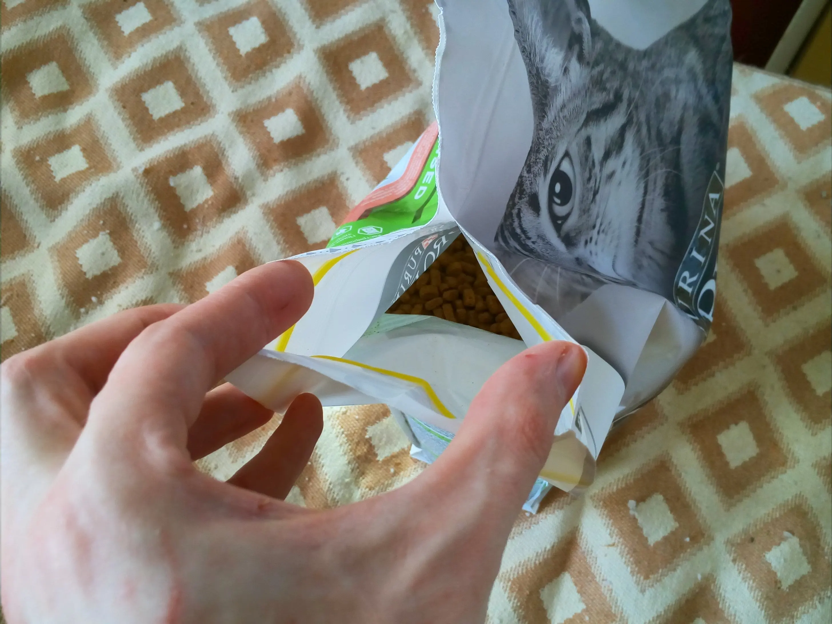 Посылка, чёрная коробка, весом 3,24 кг. В Пятигорск приехала за 4 дня, с момента оплаты. Курьером "Почта России", прямо до входной двери. Корм хороший свежий, пахнет приятно, три моих кота сразу накинулись. Изготовлен 2020.11.18, годен до 2022.05.12. По цене, гораздо выгодней покупать большие пачки, здесь цена получилось 500 рублей за килограмм, со всеми скидками, что гораздо дешевле чем оффлайн магазинах маленькими пачками. Засыпал в трёхлитровую банку, и в ещё одну чуть больше половины, чтобы не выдохся корм со временем. Хотя в пачке имеется удобная застёжка с одного края. В общем, котам всё понравилось, всем советую заказывать здесь!
