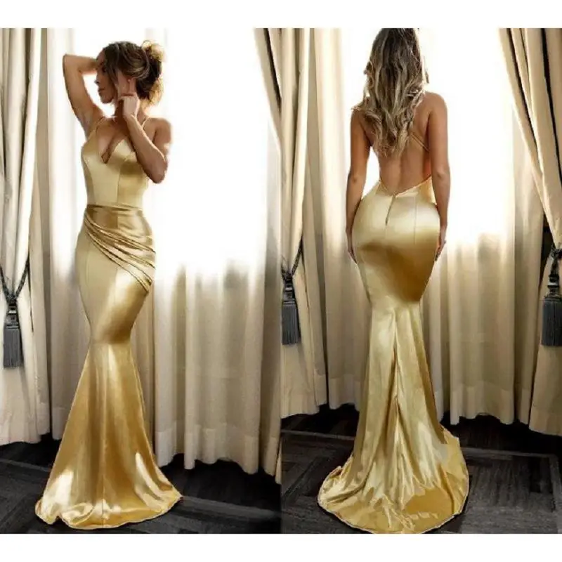 Соблазнительные золотые вечерние платья русалки 2021, недорогие вечерние платья с открытой спиной атласное выпускное платье, вечерние женские платья