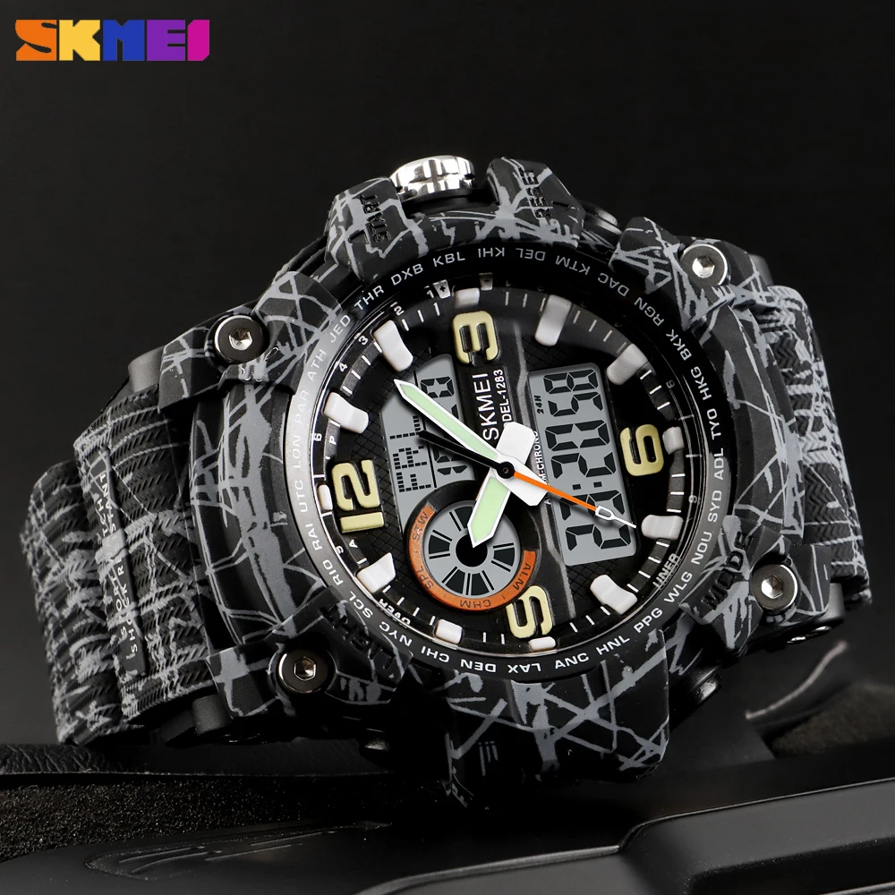 Бренд: SKMEI Тип изделия: мужские наручные часы с двойным дисплеем Пол: Для мужчин Стиль: спортивная форма для мальчиков Материал корпуса: ABS + PU Материал ремешка: полиуретан Тип застежки: Пряжка из нержавеющей стали Чехол Толщина: 17 мм Диаметр циферблата: 54 мм Длина ремешка: 260 мм Ширина ремешка: 22 мм Характеристики: 3 раза, будильник, дата, Chrono,El светильник, 50 м водонепроницаемый, 12/24 часов, неделя, обратный отсчет