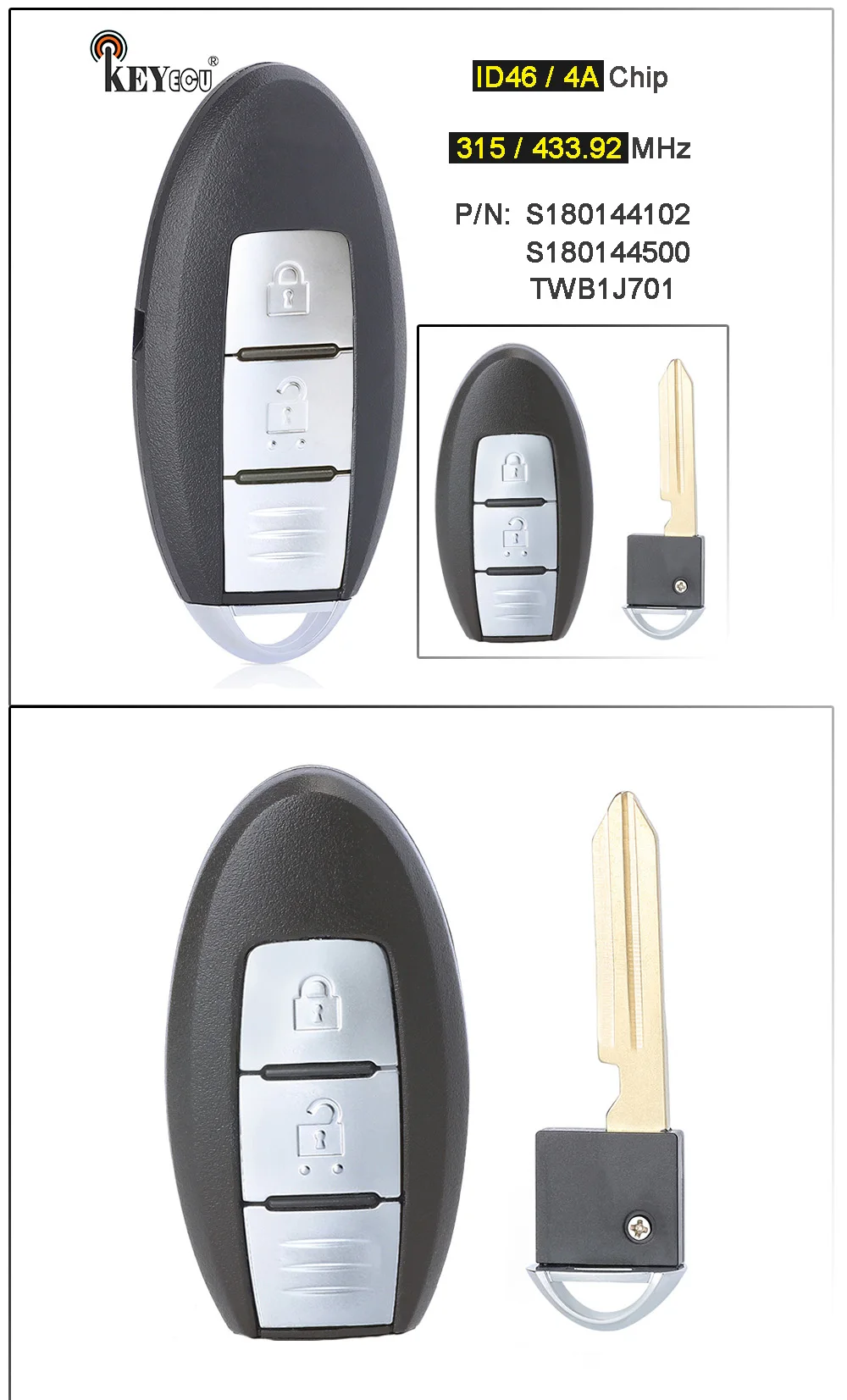 Пульт дистанционного управления KEYECU, 315 МГц433,92 МГц, S180144500 TWB1J701, S180144102, 2 кнопки, для Nissan Qashqai, March K13, Micra K13, Leaf