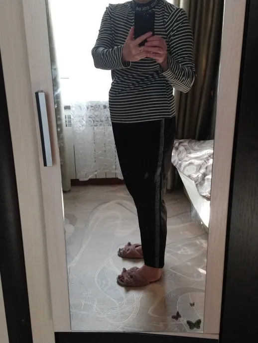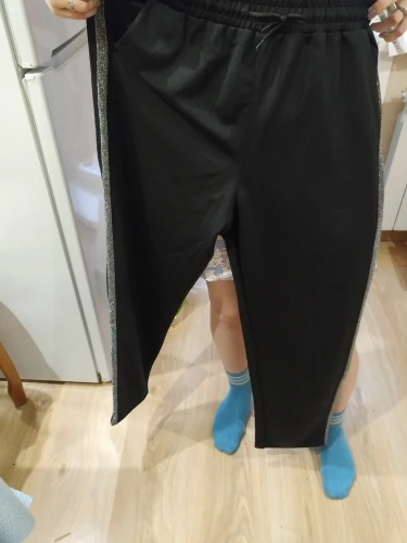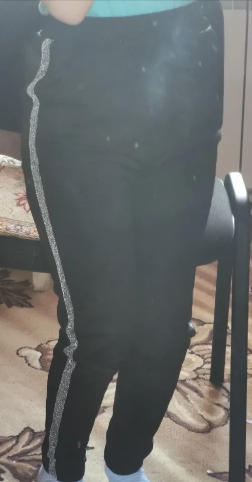 Супер штанишки,я виде похожие,но с резинкой внизу,а искала брюками и нашла ,цена ниже рублей на 400,а качество ничем не хуже,швы ровные,лампасы из люрекса,карманы правда не глубокие,но это ничего,продавец положил в подарок резинку для волос,приятно. Спасибо продавцу за качество и быструю доставку,до Москвы за две недели.вес 77,рост 164,свободно сели в бёдрах,резинка не тугая,ещё веревка есть,по росту отлично,но кто выше 170 будут короткие,хотя можно отшить длину брюк,что с резинкой внизу так не сделаешь,рекомендую девчоночки,и до 85 кг.будет хорошо