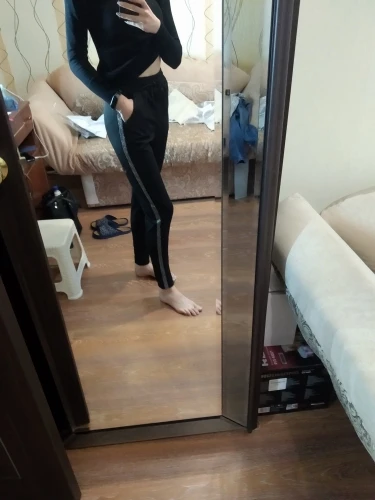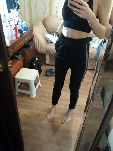 Доставка очень быстрая. Штаны качественно пошиты, выглядят как на фото, ткань синтетика приятная к телу, размер маломерит. На параметры от-66, об-92 рост 168 выбрала размер L - штаны сели хорошо, не в обтяг, в меру свободно, длина укороченная как на фото продавца. В подарок прислали резинку для волос.