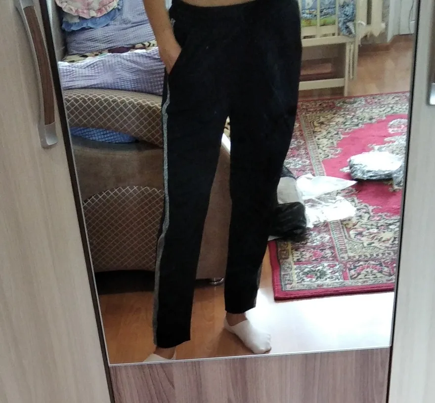 Доставка 10 дней (с пометкой плюс). Трек отслеживался. Брюки синтетика. Размер С. Мои параметры об 90, от 60, рост 165. Сидят странно, потому что верхняя часть очень высокая. На щиколотках в облипку. Коротковаты. Брала носить дома. Нитки не торчат, сшиты качественно. В подарок положили розовую резинку) С продавцом не общалась.