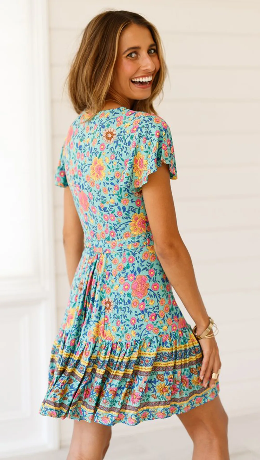 Женское платье-мини с цветочным принтом, V-образным вырезом и коротким рукавом