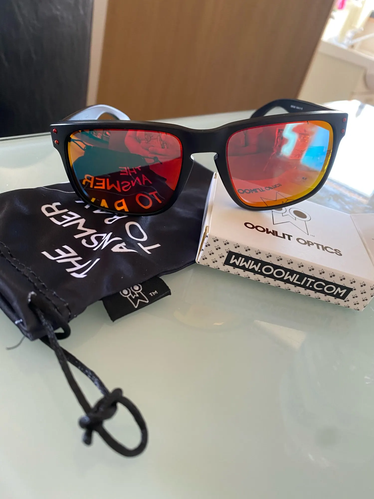 Заказ получен очень быстро, за 20 дней до нормального, фантастические линзы, совместимые с окулярами oakley holbrook, очень хороший материал и подарочный футляр для тканевых очков