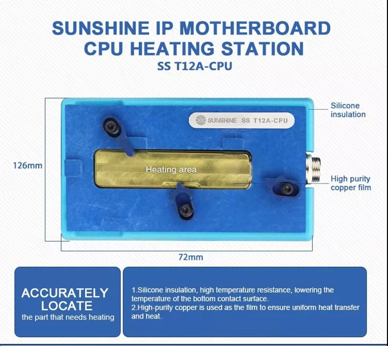 SS-T12A нагревательная станция для iPhone X XS MAX, материнская плата, распознавание лица, стратифицированная отдельная нагревательная платформа, инструменты для ремонта демонтажа-- 1. Только нагревайте область материнской платы, которая должна быть удалена, чтобы предотвратить неправильное нагревание.-- 2. Медь высокой чистоты используется в качестве пленки для обеспечения равномерной теплопередачи и тепла.-- 3. Силиконовая изоляция, высокая термостойкость, понижение температуры нижней контактной поверхности.-4. Двойная байонетная конструкция для обеспечения стабильности материнской платы на сцене.Вариант:SS-T12A нагревательная станция главный хост + четыре вида материнской платы нагревательный ПАЗ:-- T12A-X3-- T12A-CPU-- T12A-Face-- T12A-F