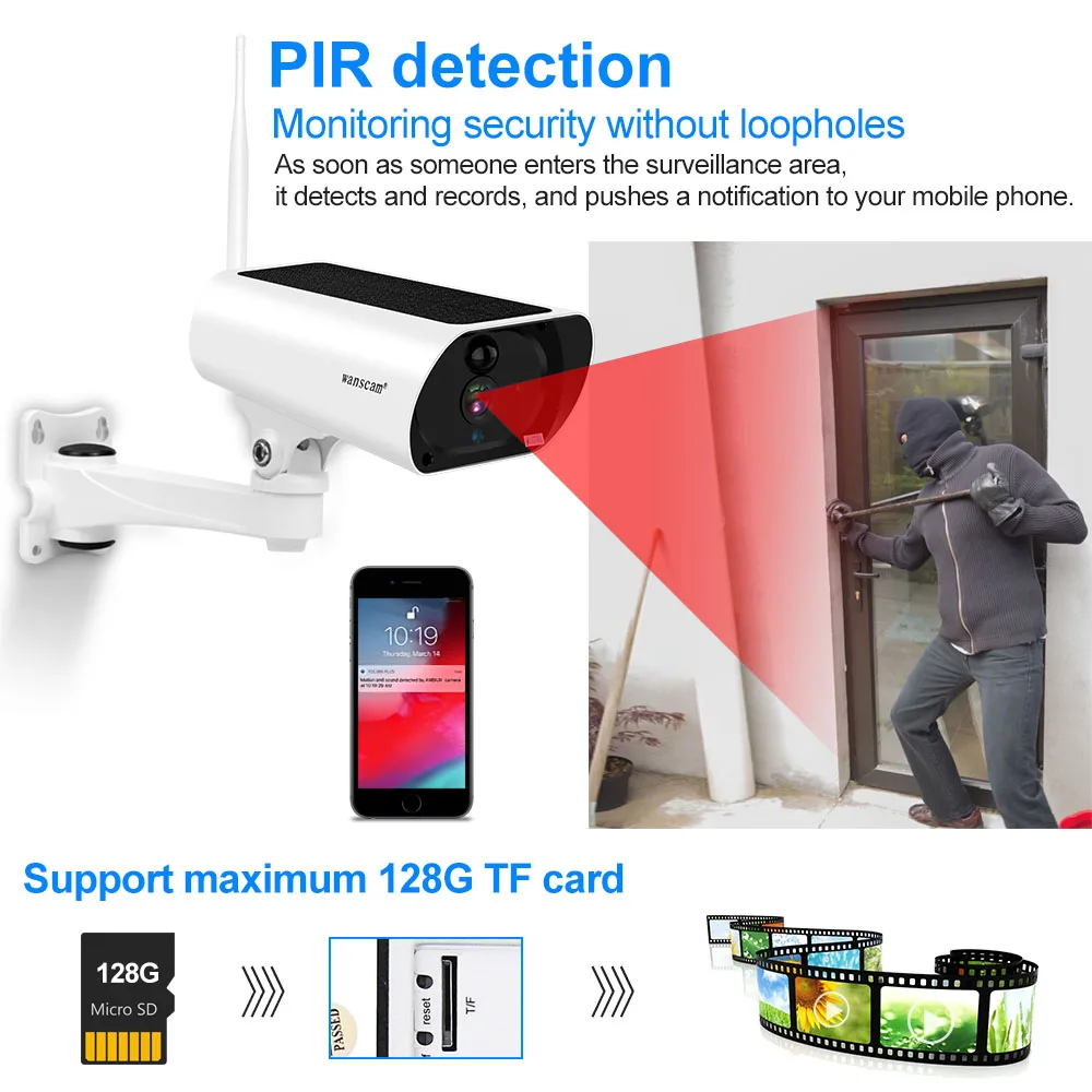 H.264, DC5V1A (не предоставляет адаптер питания). 2 MP 1080 P HD изображение 8 светодиодных ламп, ИК-расстояние 10 м. Датчик движения PIR Расстояние Wifi 100 метров 4X зум.Можно увеличивать и уменьшать масштаб для просмотра деталей каждого момента IP66 водонепроницаемый, может быть установлен на открытом воздухе Поддержка двустороннего аудио Поддержка ИК ночного видения Поддержка солнечной батареи Поддержка аккумулятора 4x18650, время работы 6 месяцев Поддержка записи tf-карт, макс. 128 ГБ Поддержка удаленного просмотра iPhone, android, смартфонов