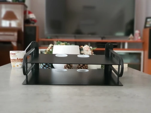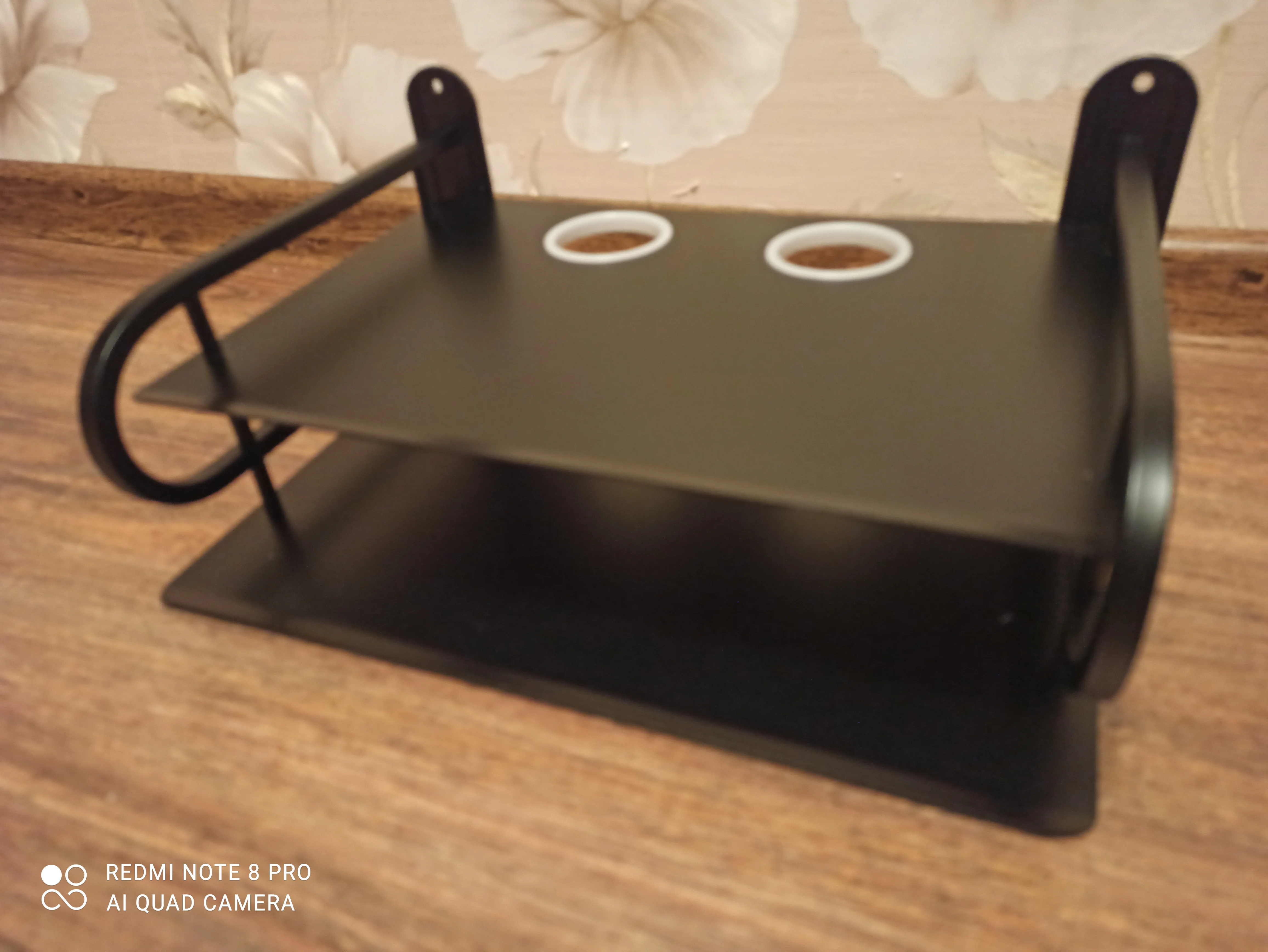 Товар соответствует описанию. Выглядит хорошо, все детали для сборки на месте. Доставка без отслеживания. Упаковано в матерчатые мешочки в коробке без пупырки. На одной из части полки была хорошая заметная царапина, но при использовании полки, данная деталь находится снизу и царапину не видно. Покупал для TV Box с вентилятором и внешнего жесткого диска. TV Box с вентилятором поставил на нижнюю полку, высота впритык, у вентилятора пришлось высокие ножки открутить (см. фото) В общем, если бы цена была дешевле, то был бы топ, а так выбор за эти деньги есть. Полочка хорошая функциональная, если именно она вам нужна, то берите. Но я бы взял другую, чтобы внутреннее расстояние между полками было больше, толстые провода тяжело внутрь пропускать.