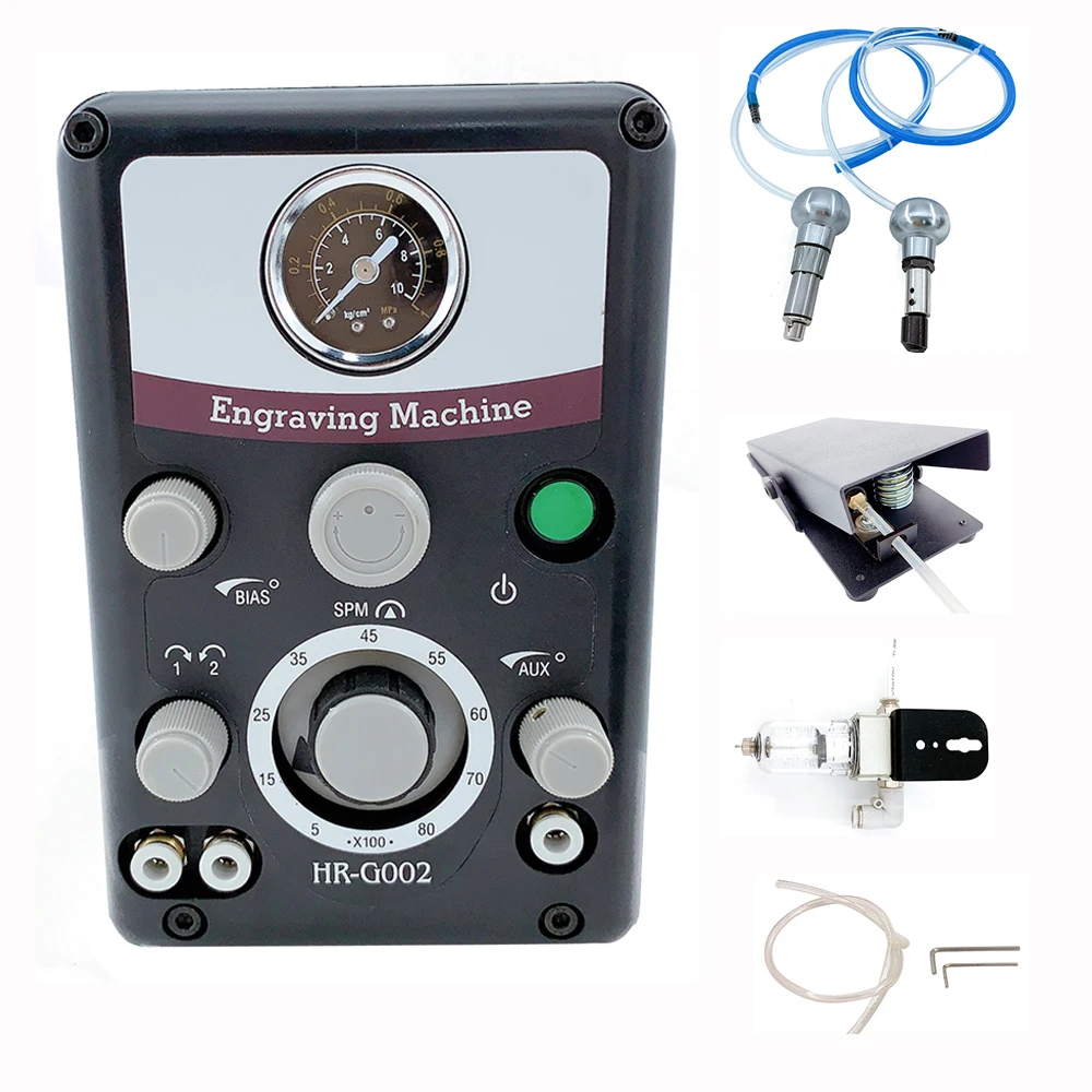 Гравировальная машина HH-G01 имеет соединения для двух ударных наконечников и вспомогательное воздушное соединение для других воздушных инструментов, включая ротационный наконечник. Две наконечники и управление одной ножкой поставляются с гравировальной машиной