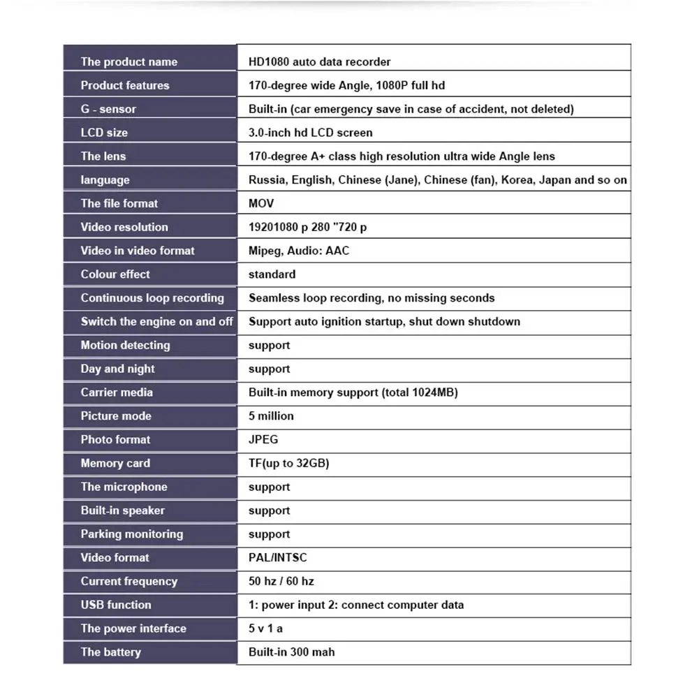 Описание:Тип проекта: Автомобильный видеорегистраторПрименение: автомобили, грузовики, грузовики и другие транспортные средства.Вес брутто: 300 граммЦвет: черныйСтиль: простойМодель: прочнаяМодель: Автомобильный видеорегистраторТип экрана: TFT экранРазмер экрана: 3 дюймаКоличество линз: 1Угол обзора: 120 градусовИнтерфейс: av-выход, USB2.0, Micro SD / TFФормат видео: AVIРазрешение камеры: HD (1280*1080), VGA (640*480)Пиксель: 1200 миллионовАккумулятор: встроенныйЯзык OSD: китайский (упрощенный), китайский (традиционный), чешский, английский, французский, немецкий, итальянский, японский, корейский, португальский, русский, русский, испанский, тайскийХарактеристики: g-сенсор, обнаружение движения, циклическая запись, SD / MMC карта, отображение времени и даты, микрофон, анти-вибрация, циклическая запись, автоматический баланс белого.Упаковочный лист:1x автоматический видеорегистратор1x кронштейн1x прикуривателя кабель 3,5 м1x руководство по эксплуатацииЕсли у вас есть какие-либо вопросы, пожалуйста, сначала свяжитесь с нами, мы предоставим вам лучшее обслуживание и решим проблему как можно скорее. Большое спасибо.