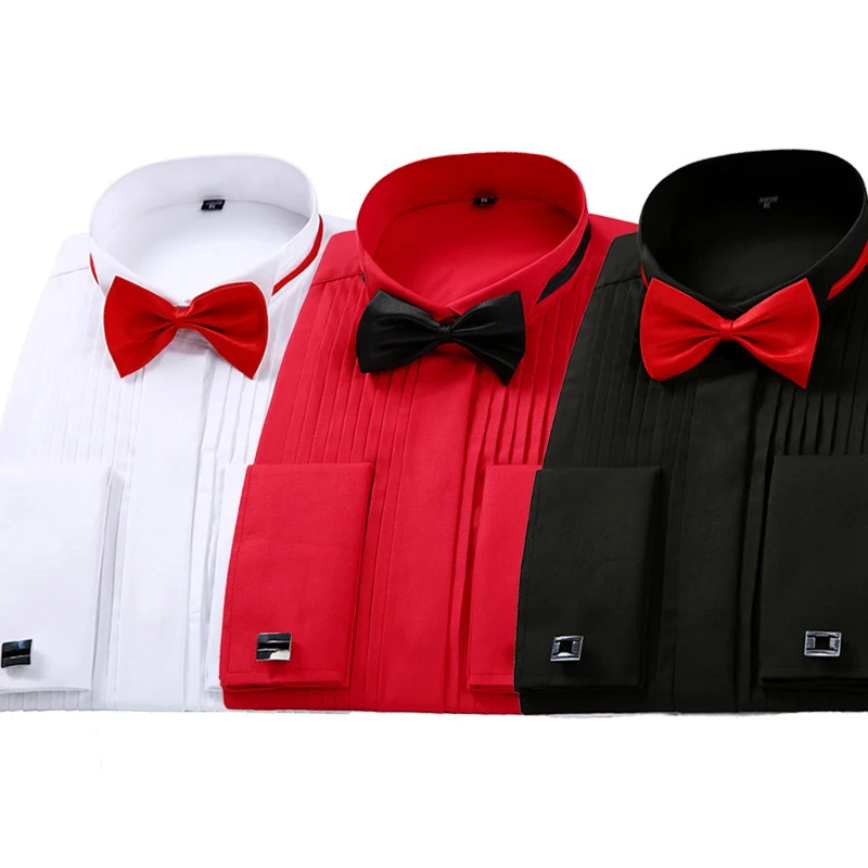 Классическая рубашка с воротником с крылышками мужские формальные рубашки под смокинг с красным и черным галстуком-бабочкой вечерние топы для жениха и свадьбы