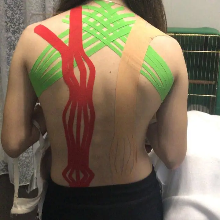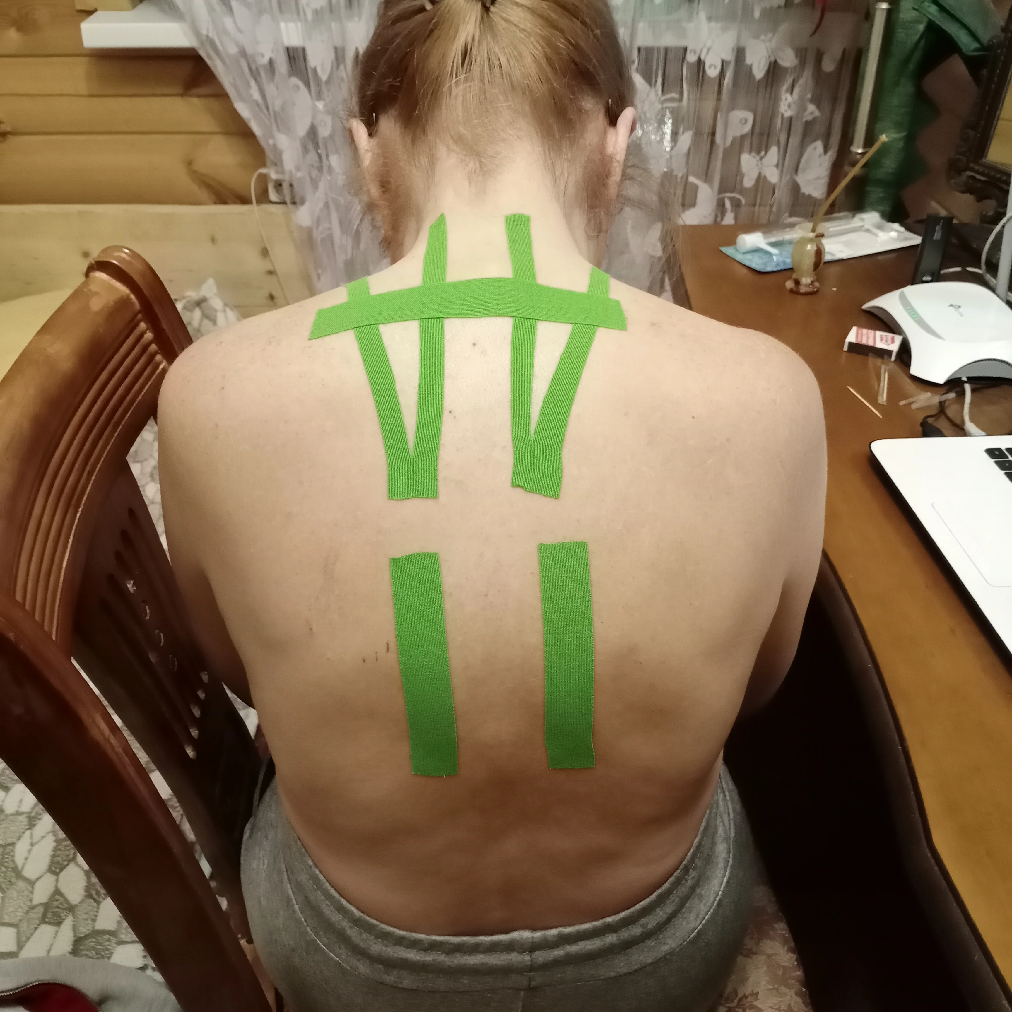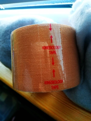 Уже вторые сутки на мне. Это мой первый опыт наклеивания тейпов, всё кривенько, но держится хорошо.