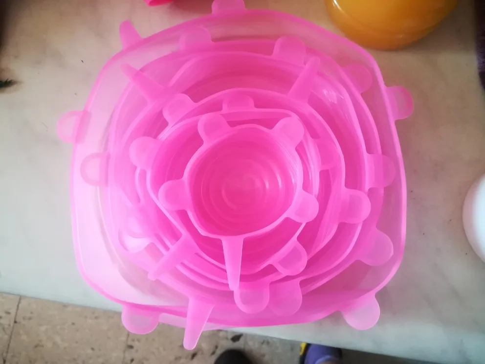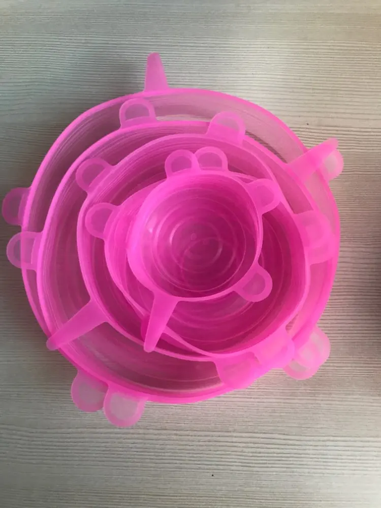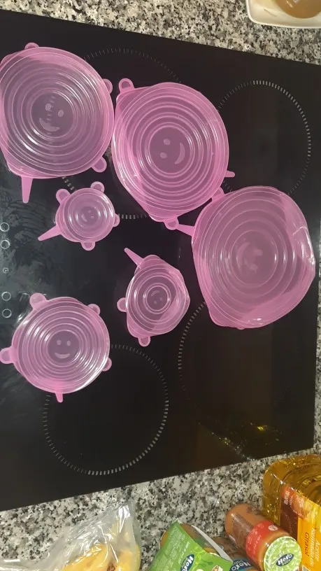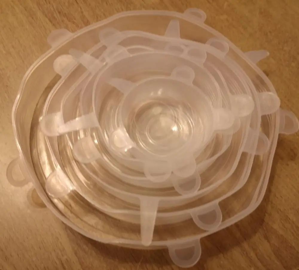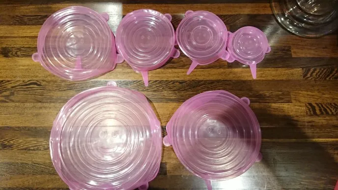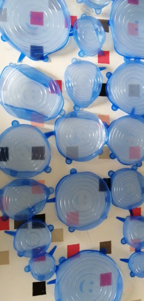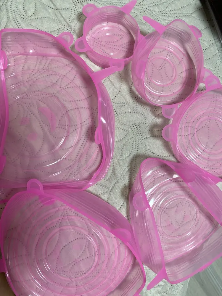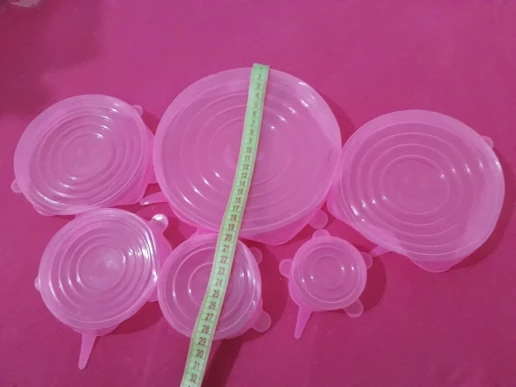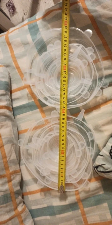 Покупкой очень довольна. Крышки мягкие, эластичные, удобные. Размеры в нерабочем положении 6,5 см, 9 см, 11 см, 13.5см, 15.5 см и 18.5 см, но за счёт эластичности например самая большая крышка (18,5) оделась на миску диаметром 22 см. Спасибо большое продавцу!